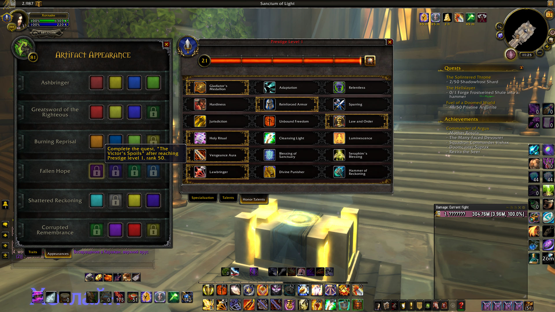 Я же говорю, был у меня облик за 1-ый престиж уже. Я получал на 50-ом уровне чести квестовый предмет и выполнил квест месяца 3 назад наверное. На скрине видно, что у меня есть 1-ый уровень престижа и открыты все PvP-таланты. На скрине первого комментария тоже видно, что у меня открыты все таланты и уже набираются уровни чести на пути ко 2-ому уровню престижа. У Дебагера проверил id достижения и квеста, пишет не засчитано, но я помню что я всё это получал уже и облик у меня был. |