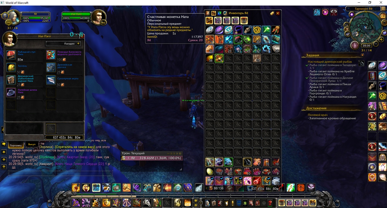 Дело в том, что я уже сделала этот квест (https://ru.wowhead.com/quest=36611/настоящий-дренорский-рыбак) и речь вовсе не о нем и не о рыбах, необходимых именно для этого квеста, хотя все рыбы я фармила примерно часов 14 (видимо лут так же не починен). Т.к. Счастливая Монетка Ната дается именно только за "Гигантсвкую/ая/ий... " (выше в обращении я упомянула одну такую рыбу и даже ссылку на нее), то фармятся эти самые рыбы примерно 1 штука в 1,5 часа (если повезет, конечно же, ну и в разных локациях естественно). Ранее, т.е. два месяца назад по словам ГМ уже отправлялась разработчикам информация о том, что нет квеста и нет в целом пристани и принято в разработку это все дело. Просто очень обидно, что в который раз (как и с Рез'аком было - хотя поставить нпс это не реализовать целую цепочку), уйдет на починку пол года или год или даже два, а для получения маунта за эти 100 монет надо потратить немалое количество времени, хотя это просто обычный долгоног, просто другой реколор. За такие мучения можно было бы хотя бы за 50 монет выставить его. Просто хочется в целом закончить гарнизон, а именно пристань, и после получить маунта. |