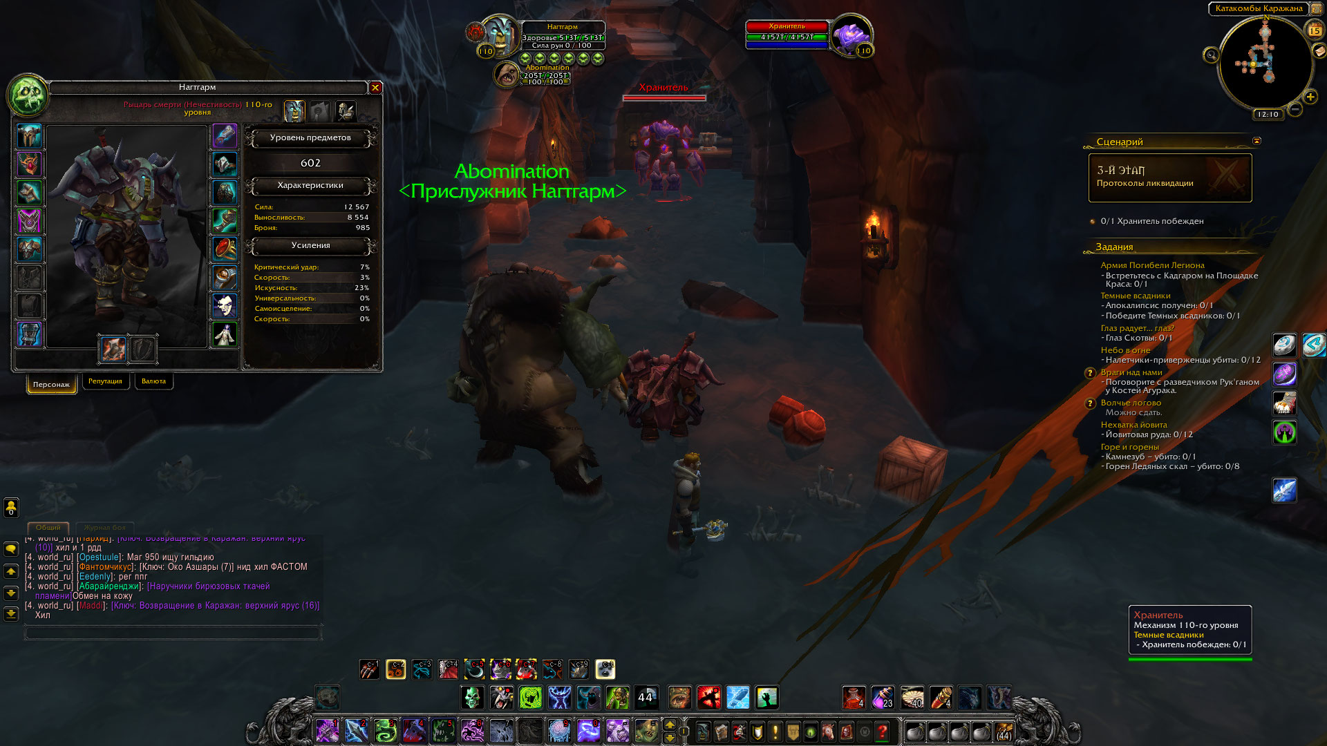 | Description | В процессе сценария надо завалить моба Хранитель. Однако, он имеет крайне большой запас здоровья (больше 4 млн) и сильно бьет, в результате даже с использованием все возможных способностей дк, зелей на здоровье и пр. чисто физически не успеваю его снести. Я так полагаю, что это связано со скалированием относительно уровня персонажа, т.к. пока пытался пройти сценарий набил 2 уровня (и при 108 моем у него было 2+ млн хп, а как достиг 110 - прыгнуло до 4+ млн). Возможно я, конечно, чего-то не понимаю и механик не знаю, но думается, что стандартный моб по сюжетному квесту не должен быть настолько убойным =) Хотелось бы понять, что в такой ситуации делать. Прикладываю скриншот с разницей показателей. Сервер Legion x100 Орда - Нагтгарм | ||||
