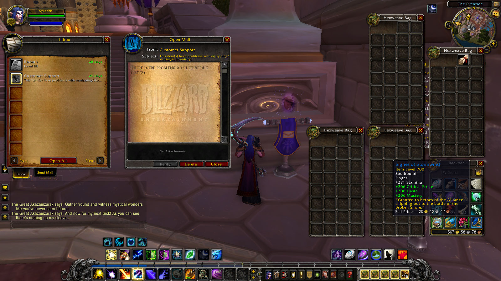 | Description | I have a Signet of Stormwind that I got from a quest right before starting the Broken Isles. For some reason, it ended up being sent to me in the mail. The letter was from "Customer Support and said there were issues equipping it. (Picture attached) Sure enough, the ring had disappeared from the spot where it was equipped before. I also can't equip the ring now that I've retrieved it from the mail. (Picture Attached) | ||||