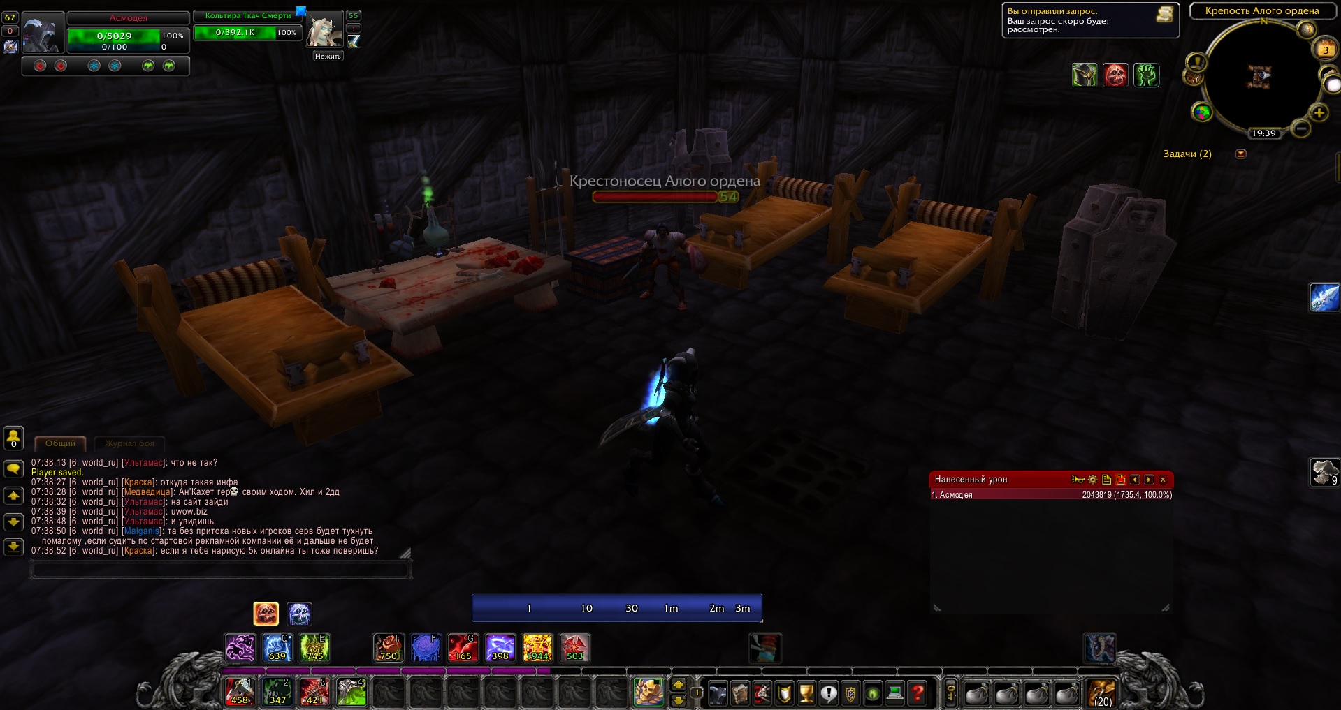| Description | Является обязательным в выполняемой ДК цепочке. По описанию, необходимо найти Кольтиру ткача смерти, которого держат в крепости. По хорошему, он будет находиться в подвале, в комнате пыток, лежать на столе и ждать своего героя. Но по приходу героя - Кольтира отсутствует (уже 52 минуты). Более того, при наборе команды /цель Кольтира - берется в таргет этот же НПС, но в интерпретации другого квеста, уже в броне и боевой готовности (судя по иконке на скриншоте). Но при постановке на него любой метки (для наглядности) и осмотре территории вокруг - метку не видно. Делаю вывод, что НПС где то в текстурах, и он не тот, который нам нужен, т.е. кв забагался. | ||||
