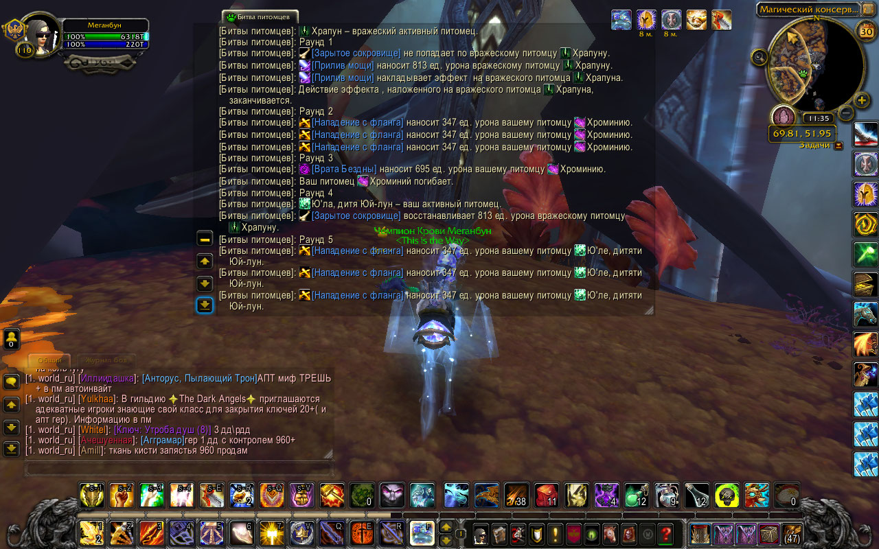 Хм, странно что ваш питомец пропускал раунд, пока такого не встречал, буду пробовать https://ru.wowhead.com/pet-ability=193 - атакует 1-2 раза и плюс один, если питомец атакует первым, то есть 2-3 раза. Судя по скринам он и атакует первый из-за характеристики "Скорость" https://ru.wowhead.com/pet-ability=578 - да, на пятый раунд должно было юзаться. Возможно это как-то связано с тем, что питомец промазал хилом по себе (что тоже странно, но я могу чего-то не знать, только недавно начал заниматься изучением баттл петов) |