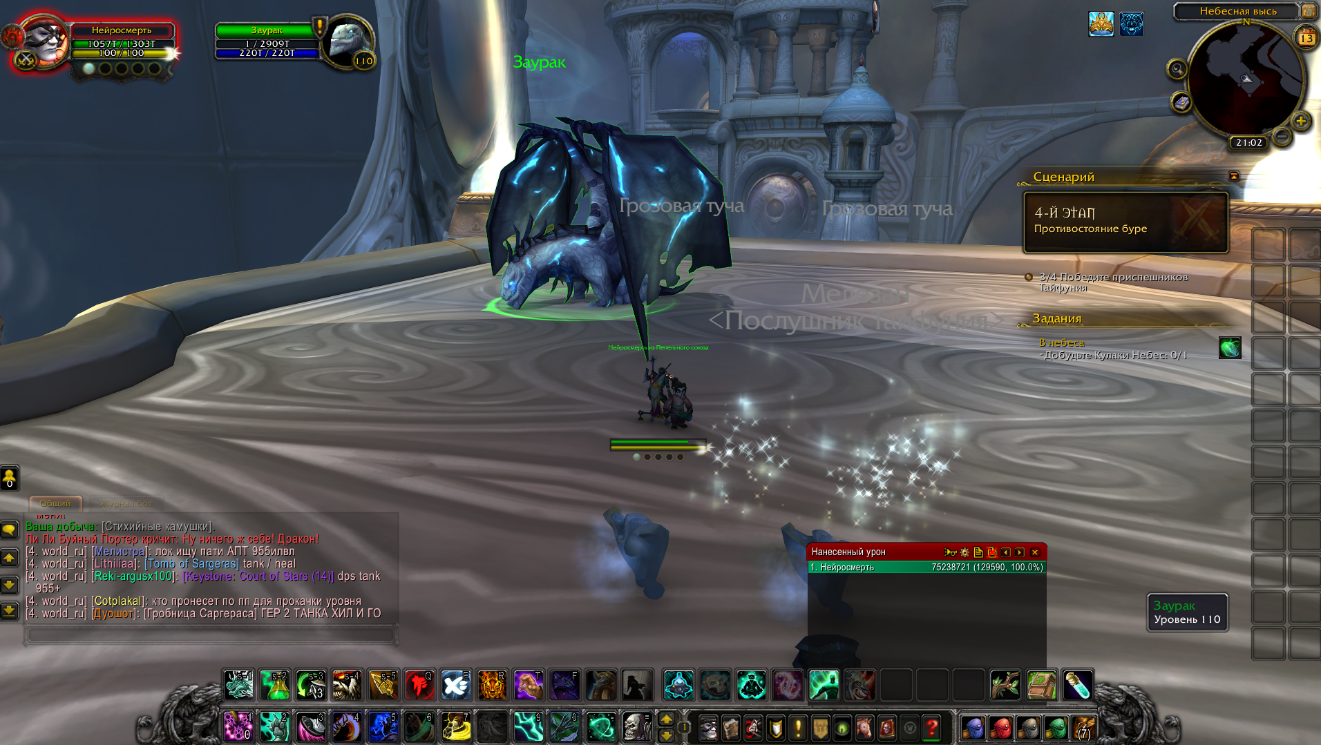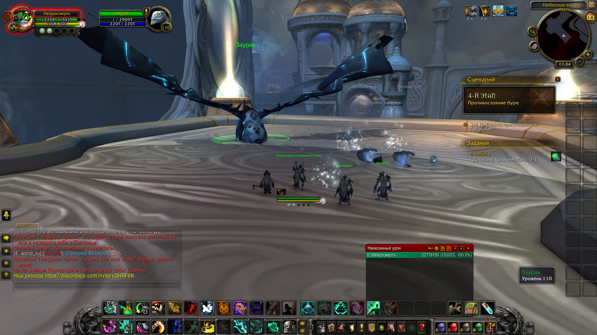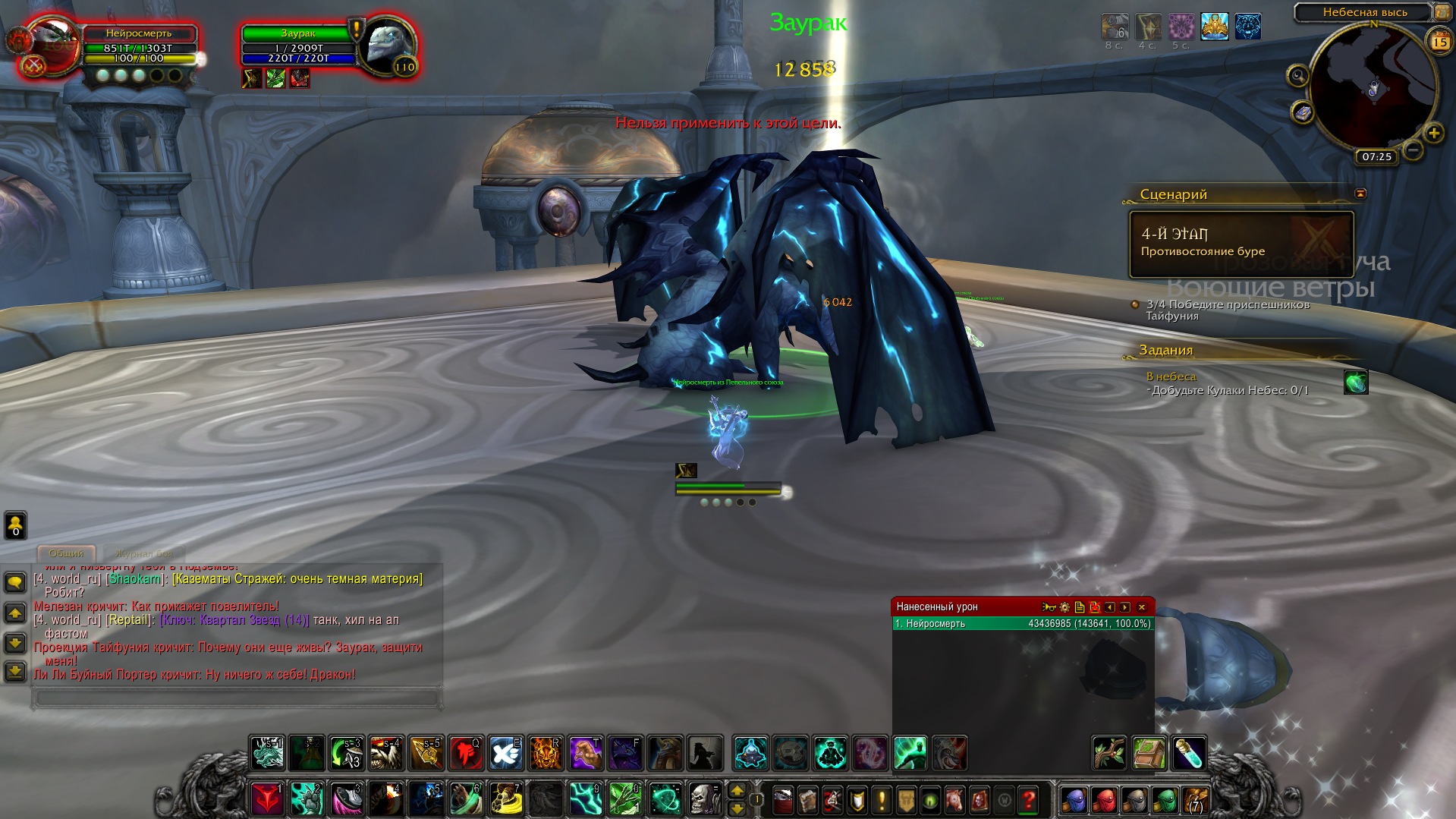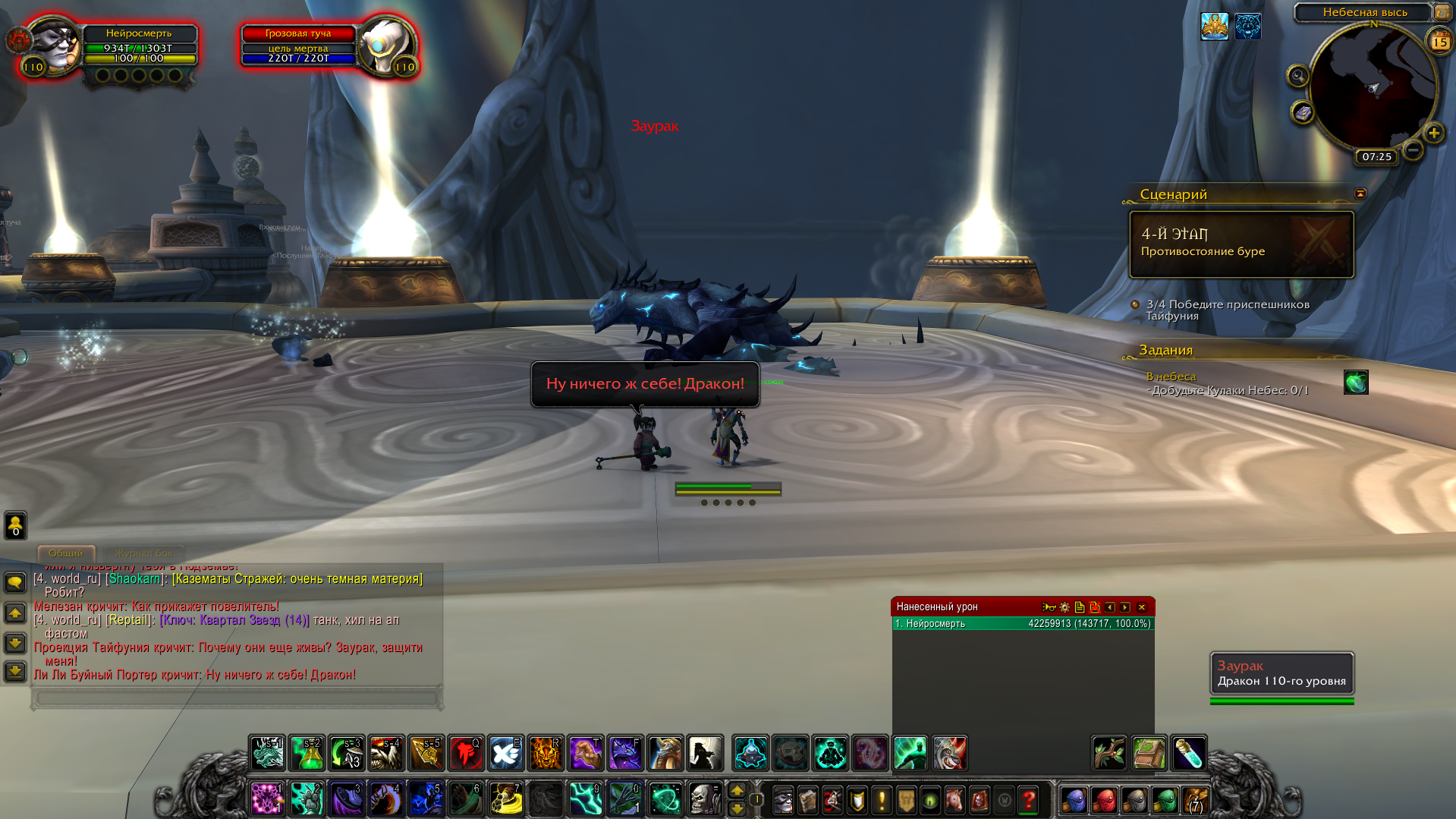 Удалось воспроизвести баг. Если в бою с Заураком использовать https://ru.wowhead.com/spell=137639 то он багается и не переходит на фазу со взлётом. В данный момент, логично, что бы пройти сценарий - не нужно использовать этот спелл, либо взять другой талант в последнем тире (https://ru.wowhead.com/spell=152173), который заменяет https://ru.wowhead.com/spell=137639 |