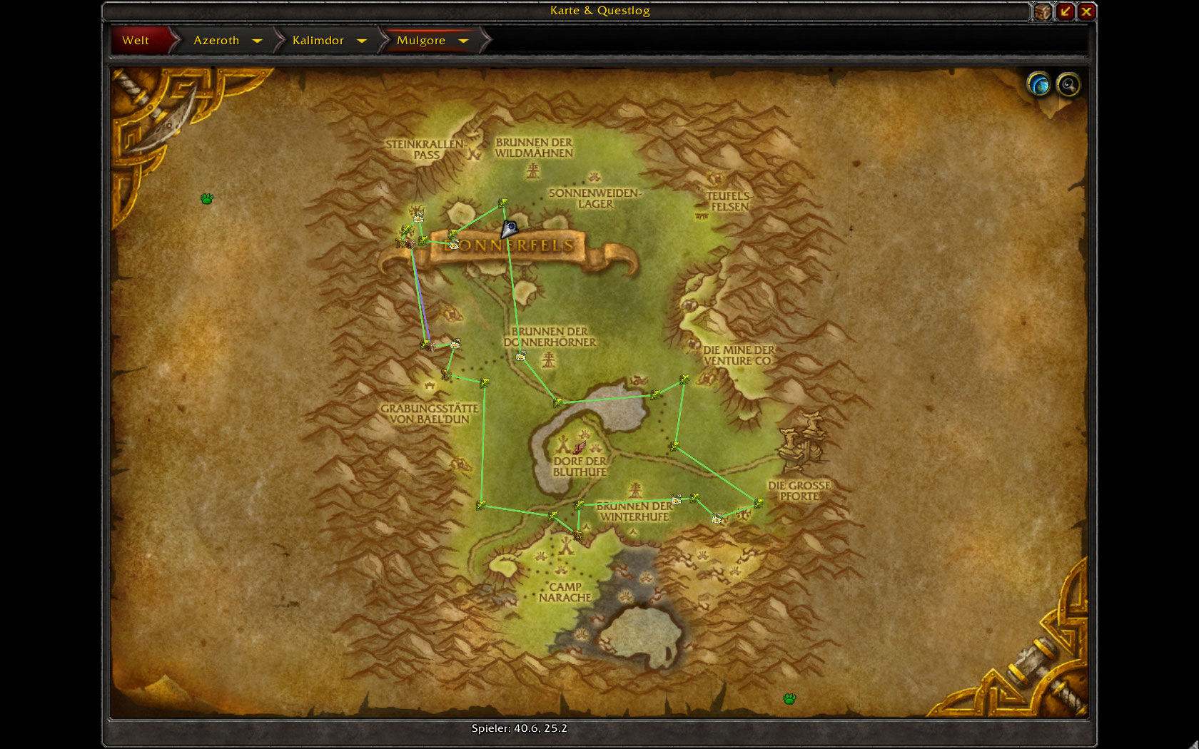 | Description | In Mulgore habe ich zwei "ramponierte Truhen" gefunden (Koordinaten 31.2, 27.1 und 32.9, 42.8). Diese Truhen waren bisher immer leer. Ich erhielt keine Gegenstände. Auf "Den Goldenen Ebenen" befinden sich keine Mobs und ich habe bisher auch keine Pflanzen für Kräuterkunde gefunden. | ||||