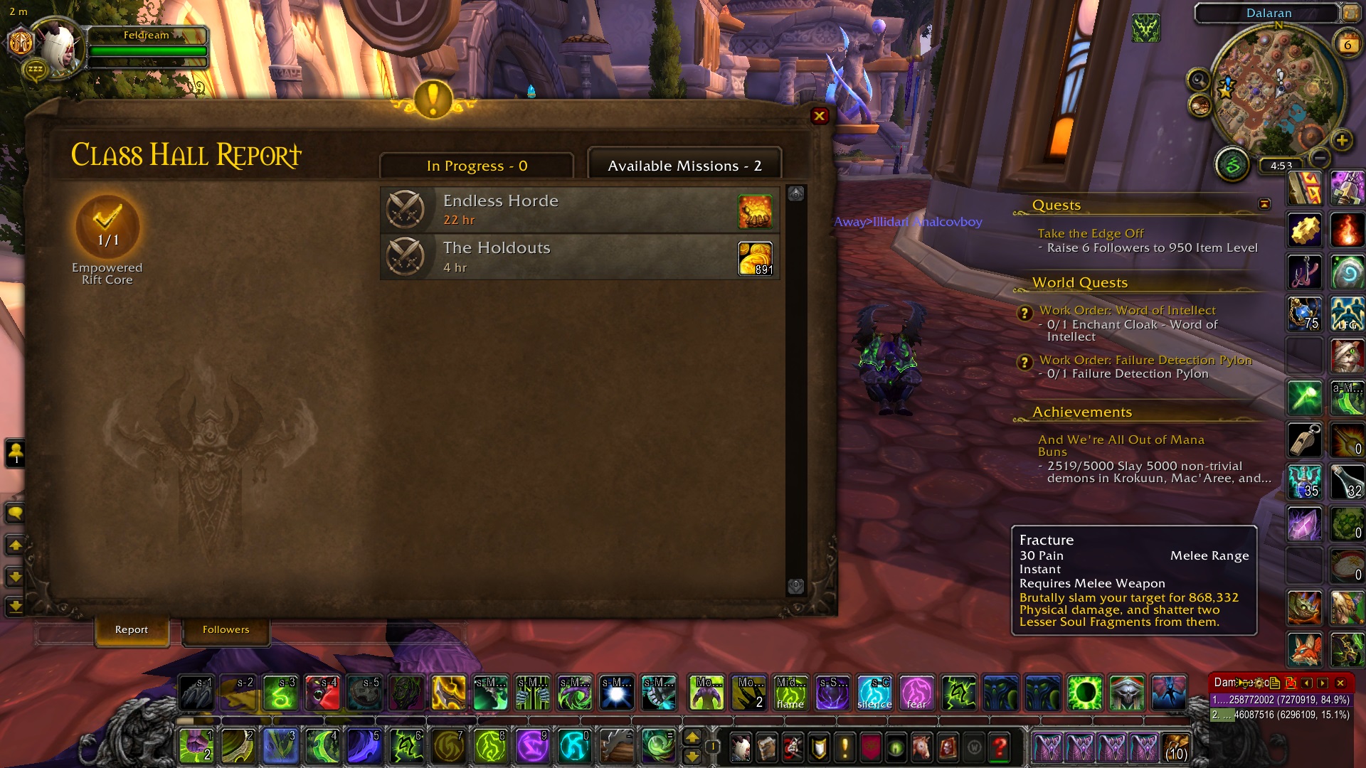 | Description | There was a fix on this quest https://www.wowhead.com/quest=48600/take-the-edge-off on 30.10.2020 but you still can't complete the quest. The reason is you can't get more missions with https://www.wowhead.com/item=151844/xenedar-armor-set after the 1st one. So most players can get only 1 mission (https://www.wowhead.com/item=151844/xenedar-armor-set x1) and after that there are no more missions even if you abandon and take again the quest. I managed to start 2 missions at the same time and get 2 https://www.wowhead.com/item=151844/xenedar-armor-set but that is it for me too. | ||||