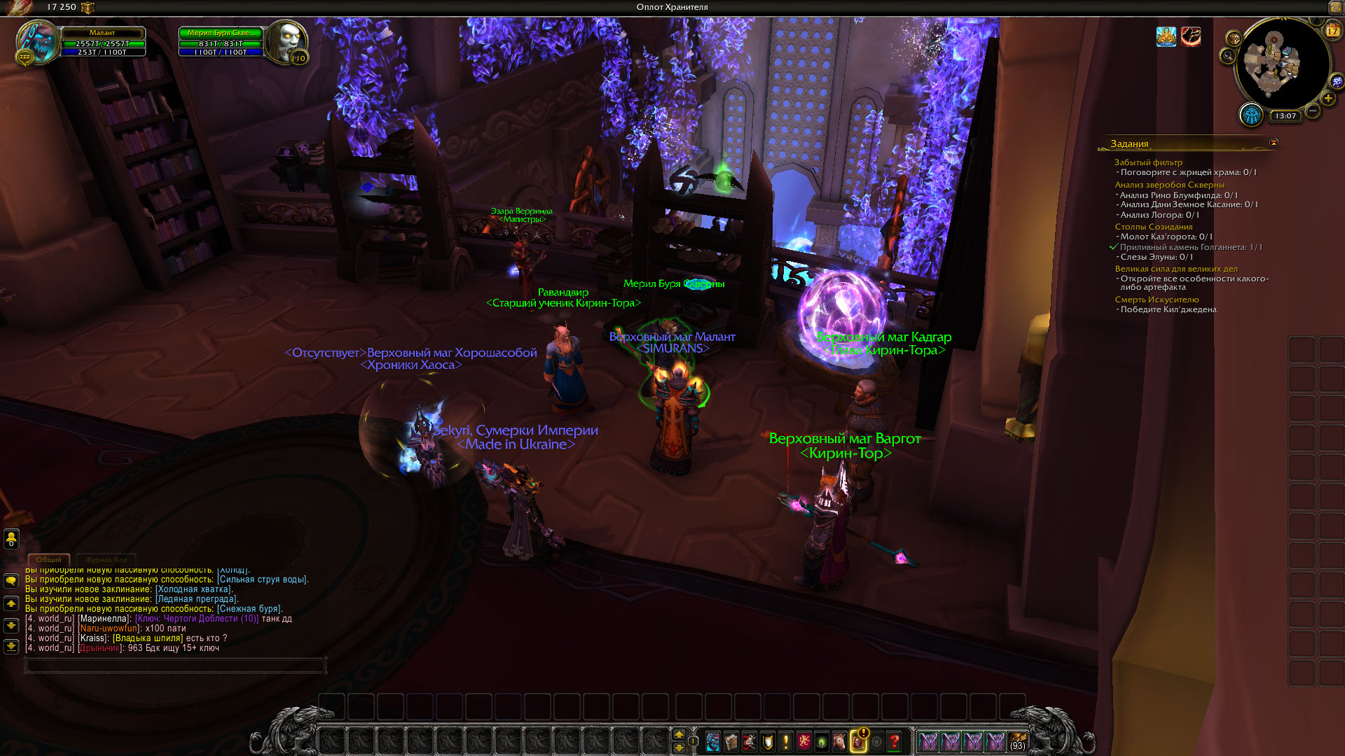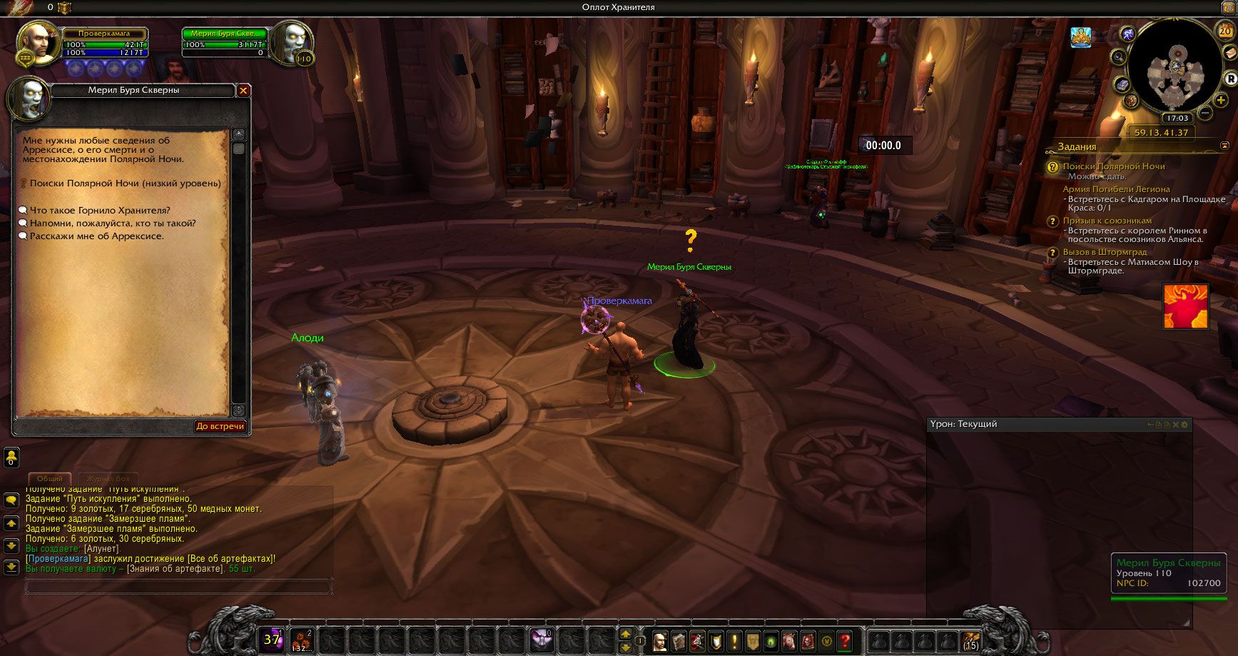 >> Еще добавлю,после получения квеста Поиски Полярной Ночи нужно Еще добавлю, перед получением стартового квеста на любой еще не полученный артефакт нужно подойти к книге и выбрать из оставшихся нужный артефакт. Сами квесты на выбор артефакта (первого, второго и т.д.) несут исключительно информационную нагрузку - книгая является хабом, который подготавливает пространство для выполнения соответствующей цепочки квестов (меняет фазы при необходимости, расставляет нпс и т.д.) Будучи однажды использованной для выбора артефакта, повторно выбрать тот же она не даст. Тем более если Вы получили первый квест цепочки и выполнили его. Вы сдали квест Мерил? А что за квест торчит на радаре рядом с книгой? Вариантов два - либо квест от Кейлека либо квест от Алоди. Вы не указали фракцию - в случае если фракция Орда - следующий квест Самоцветы Алоди выдает именно Алоди рядом с книгой. Если же фракция Альянс - Вы правы - квест должен выдавать Мерил. Традиционное предложение - установить аддон BtwQuests и сделать для нас скриншот цепочки на получение этого артефакта. Ссылку на аддон можно найти на форуме Uwow или здесь на трекере по ключевому слову. |