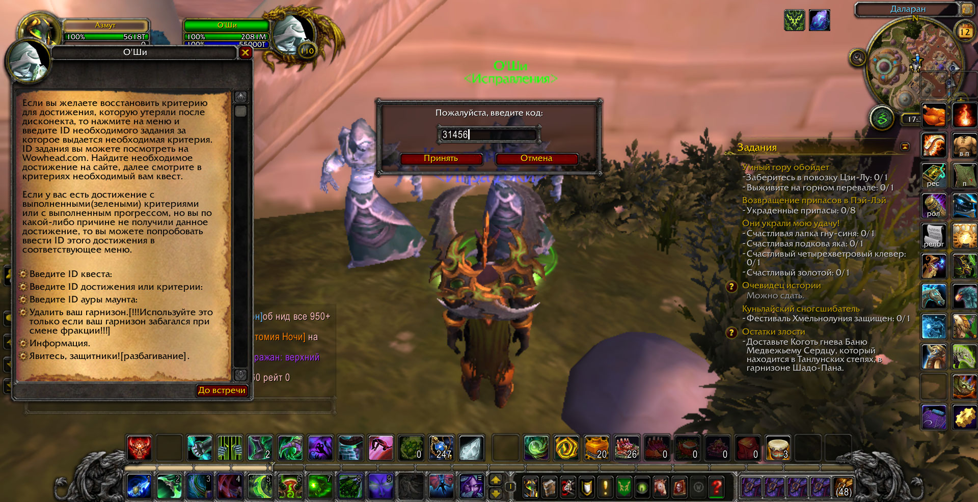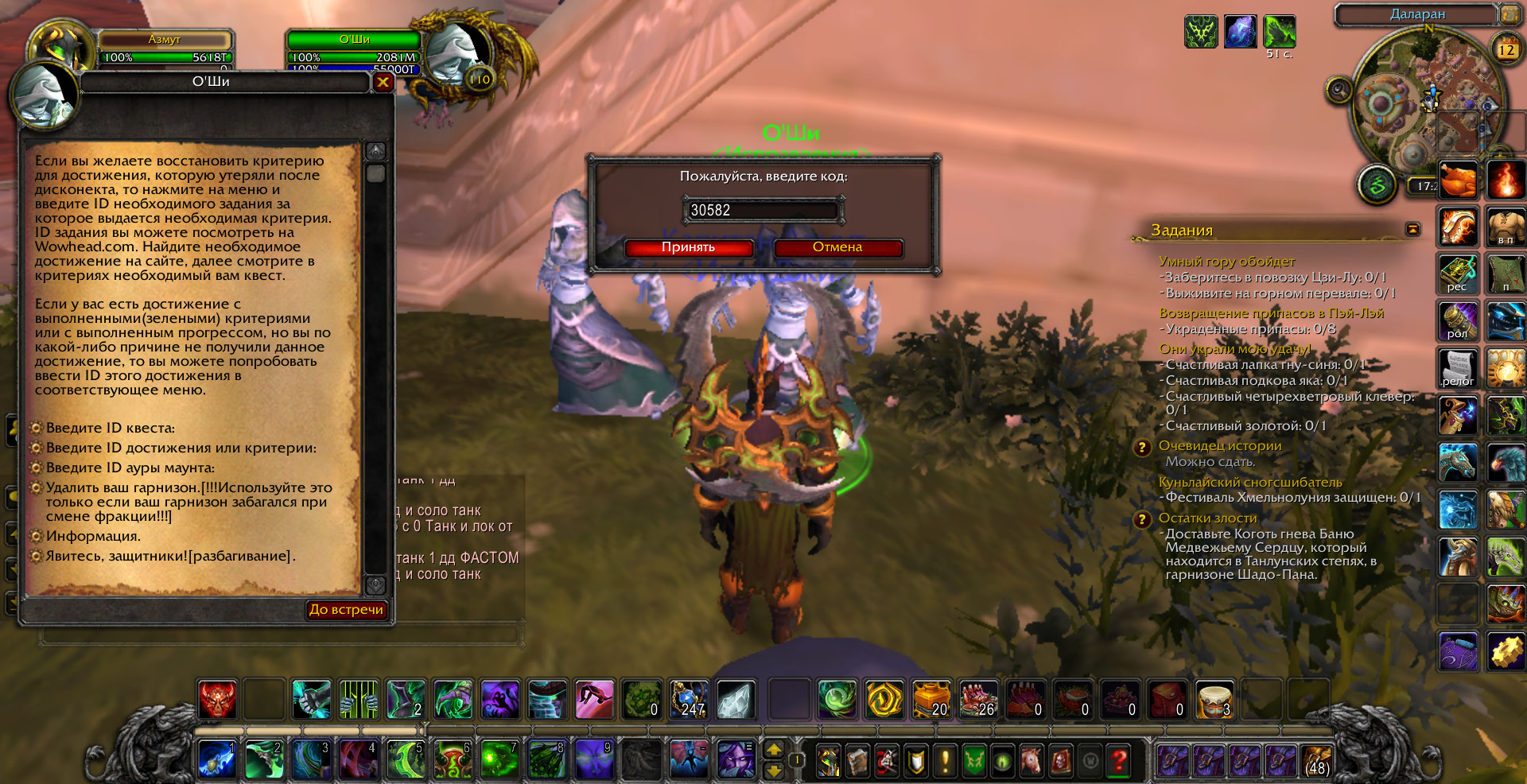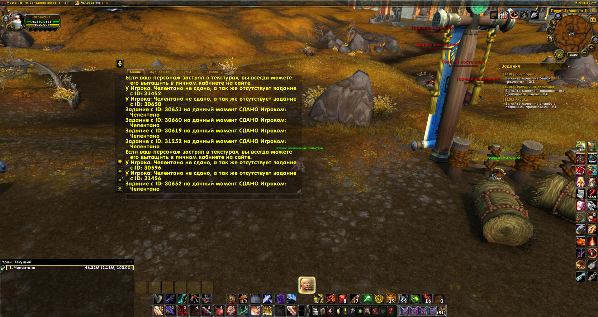 в том скорее всего и проблема что квесты Покойная госпожа Мускусная Лапа(30585) и Повелитель Ужаса(30804) выполнены но при проверке(/run print(IsQuestFlaggedCompleted(30582)) пишет что не выполнены и еще нет нпс в пещере на квест Мускусная Лапа: пропавший сын.При попытке исправить у нпс квест пишет что квест выполнен,скрины прилагаю. |