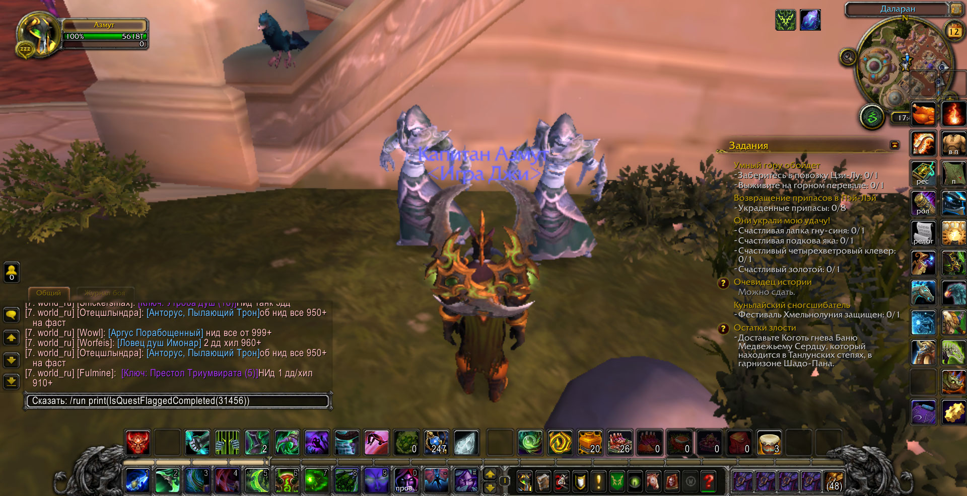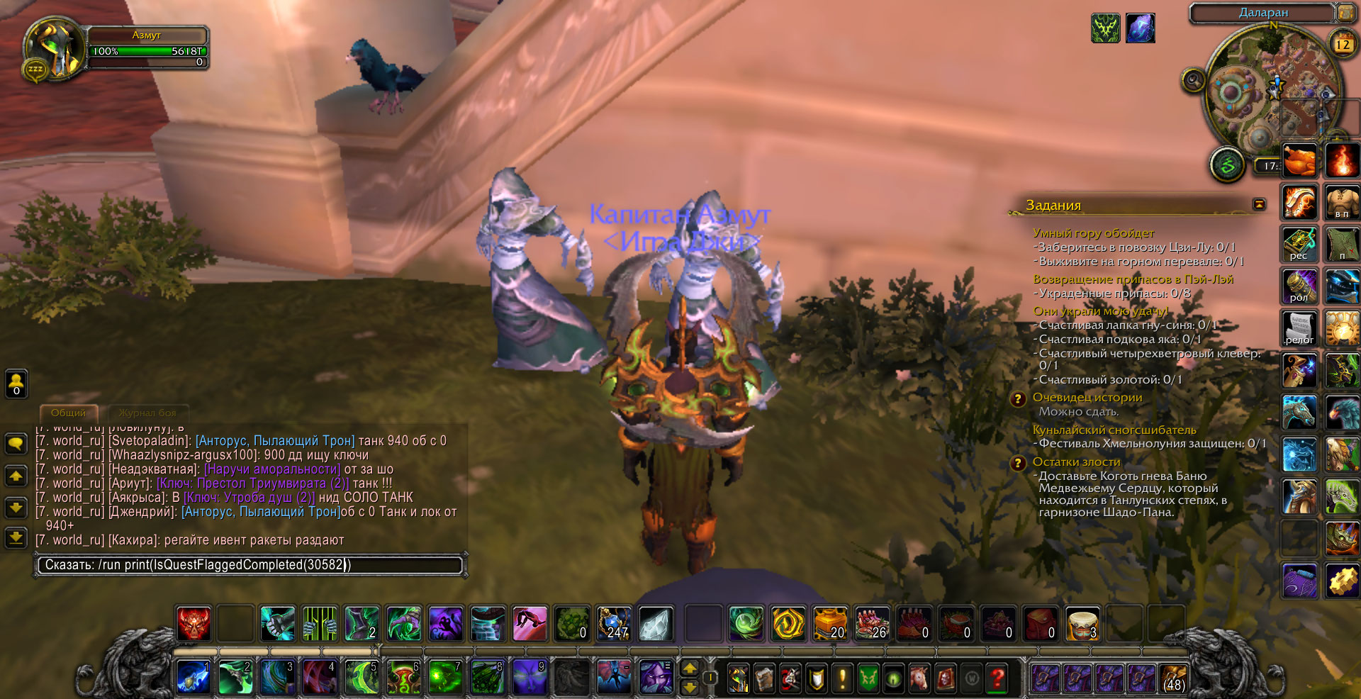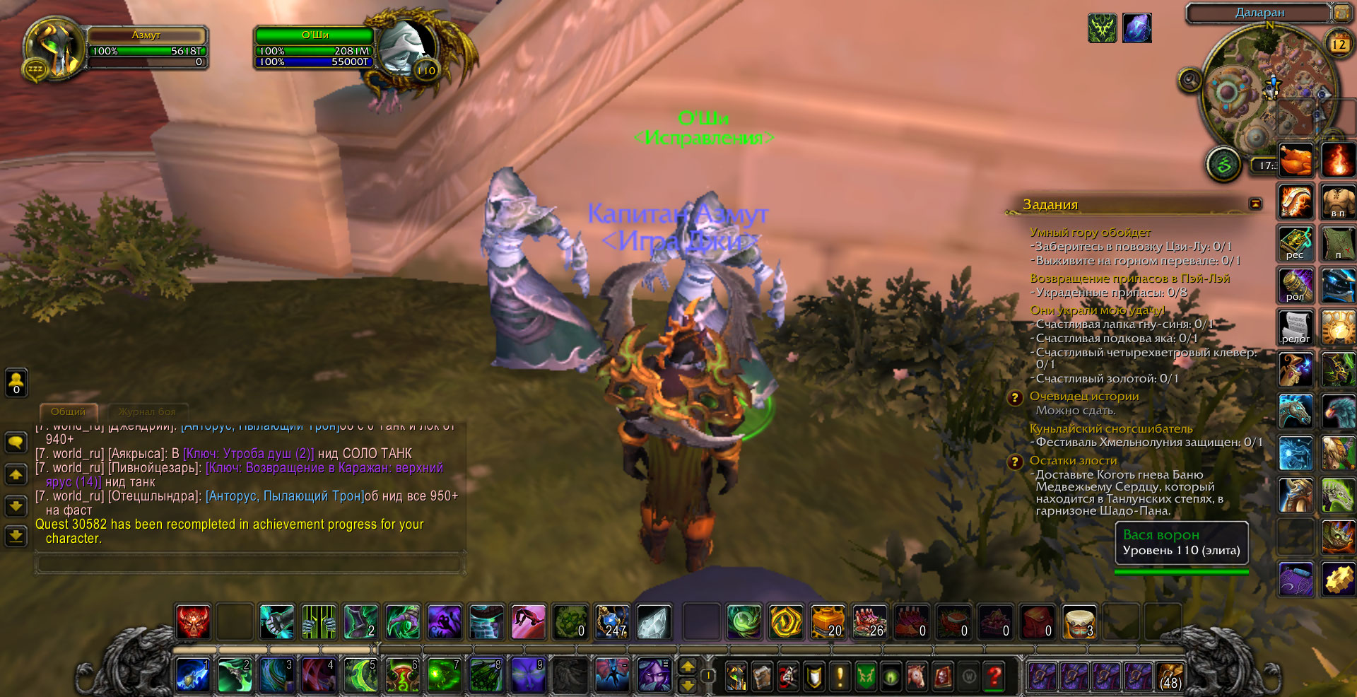 в том скорее всего и проблема что квесты Покойная госпожа Мускусная Лапа(30585) и Повелитель Ужаса(30804) выполнены но при проверке(/run print(IsQuestFlaggedCompleted(30582)) пишет что не выполнены и еще нет нпс в пещере на квест Мускусная Лапа: пропавший сын.При попытке исправить у нпс квест пишет что квест выполнен,скрины прилагаю. |