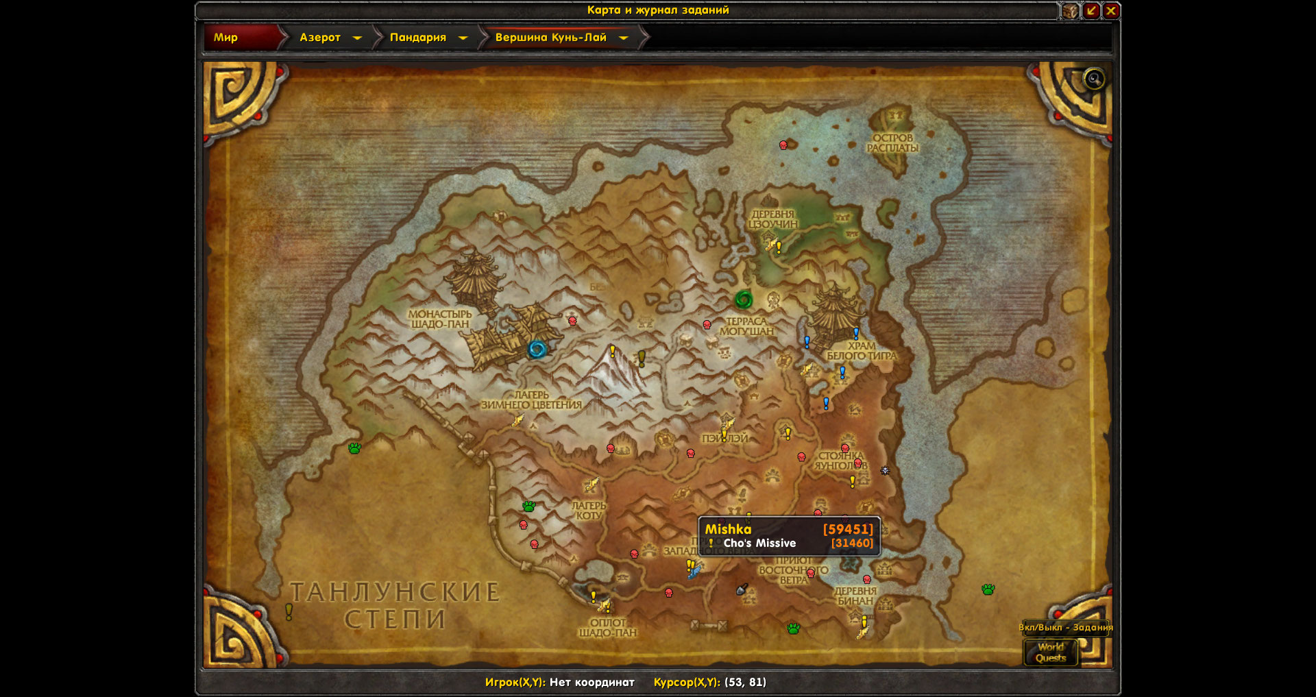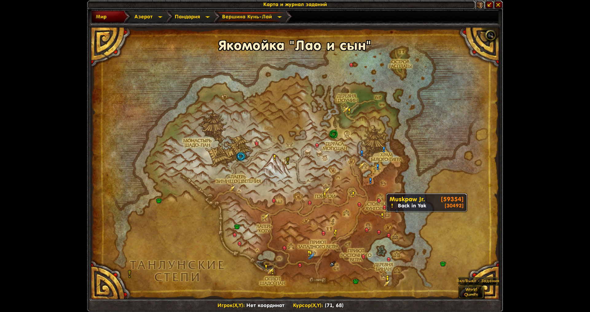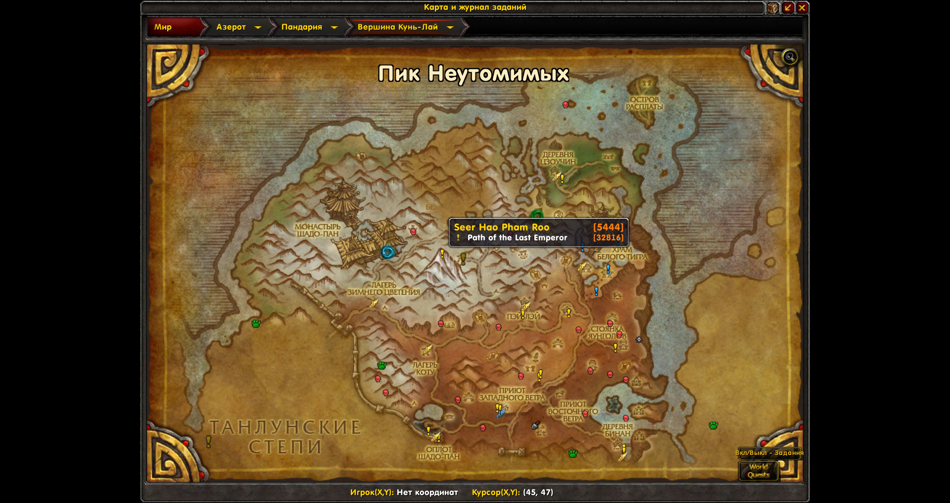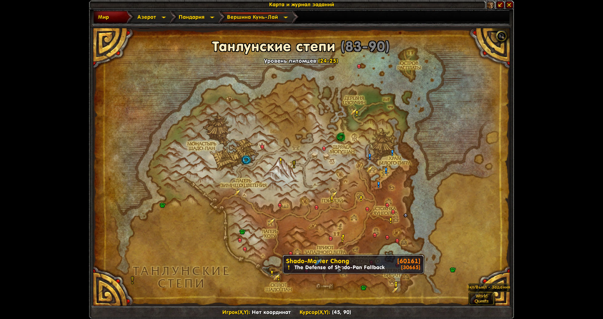 И ещё,аддон показывает на карте невыполненные квесты 30611(сценарий-не реализован),30682,30665,31455,31460,30492,30999,30601,30945,32816.Значки квестов на карте есть,но по факту в локации доступные квесты отсутствуют.Ниже скрины с картой |