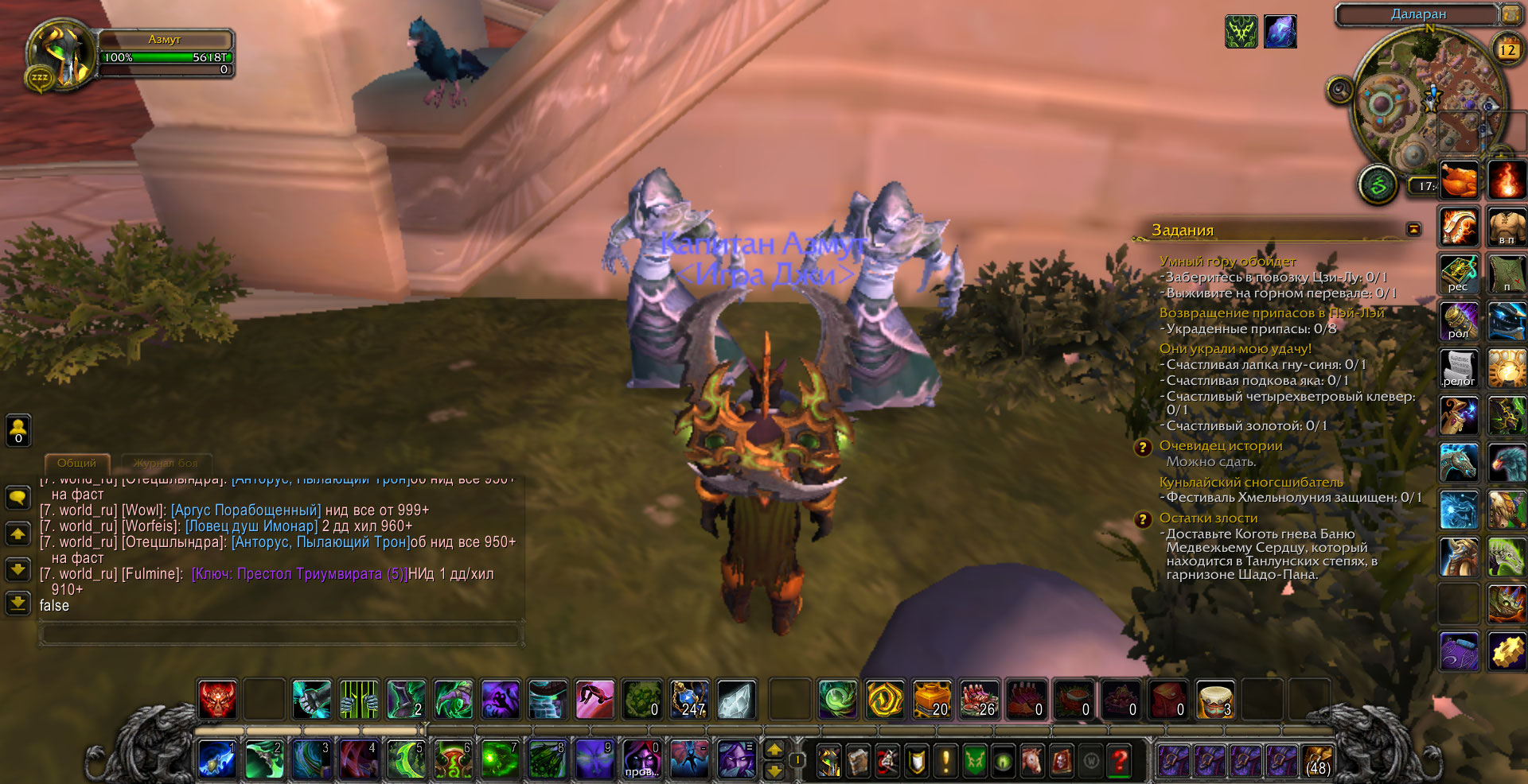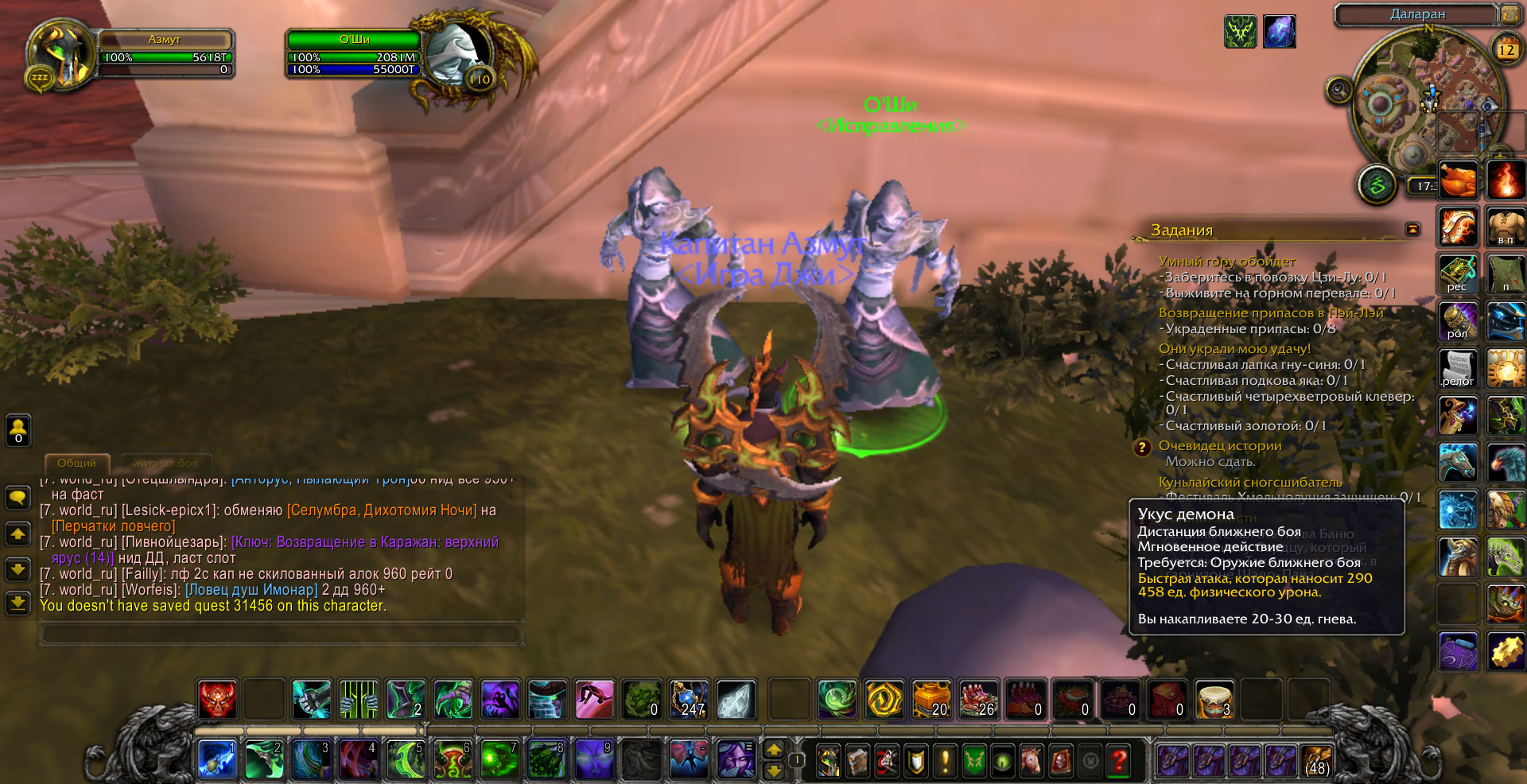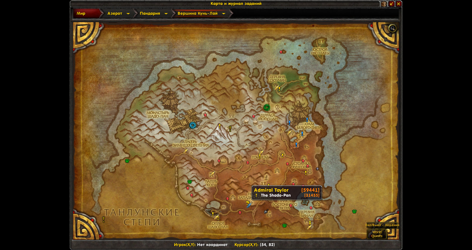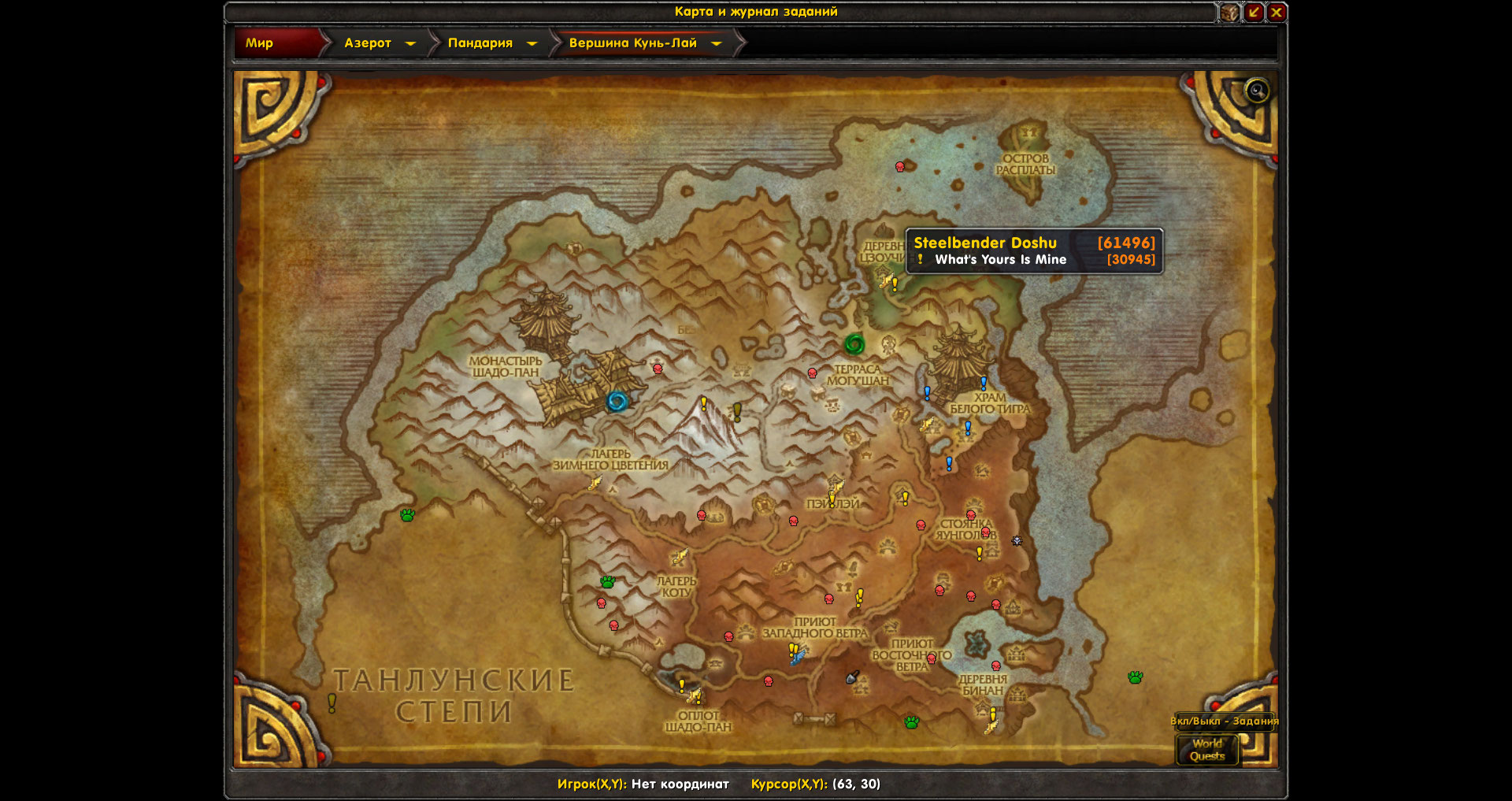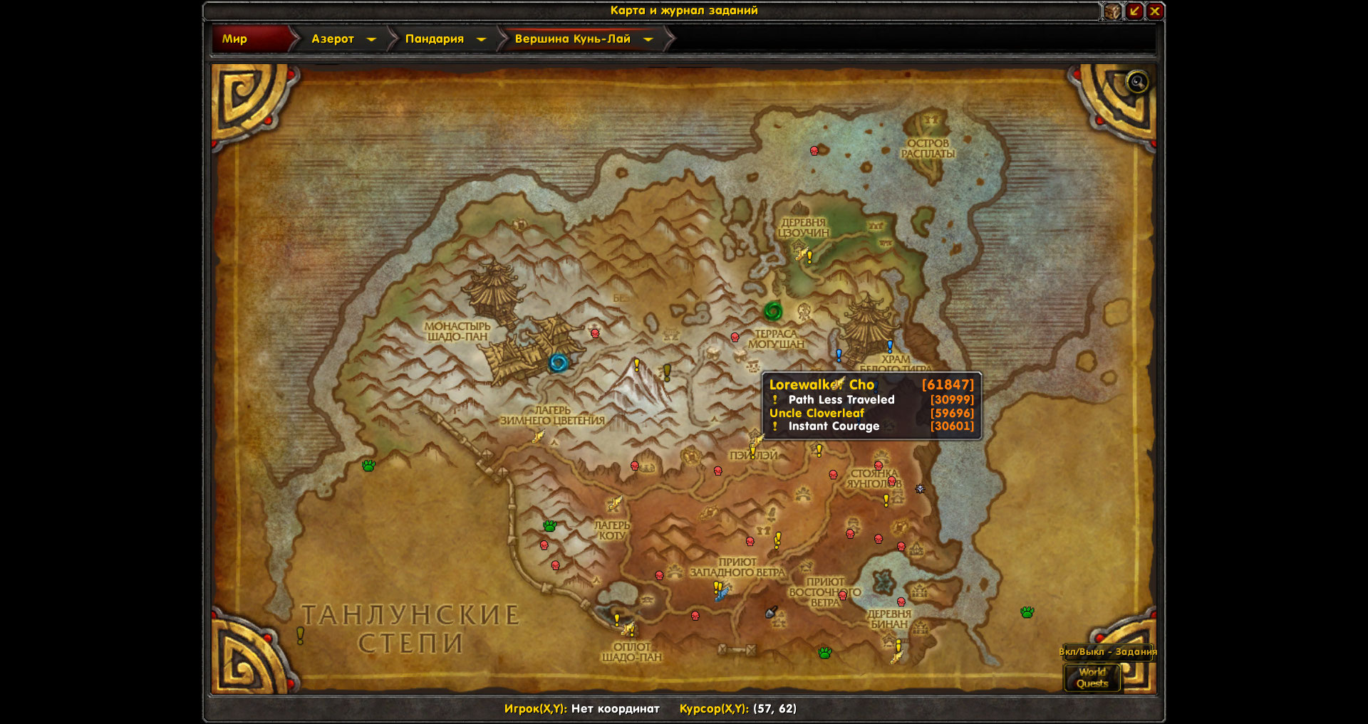 И ещё,аддон показывает на карте невыполненные квесты 30611(сценарий-не реализован),30682,30665,31455,31460,30492,30999,30601,30945,32816.Значки квестов на карте есть,но по факту в локации доступные квесты отсутствуют.Ниже скрины с картой |