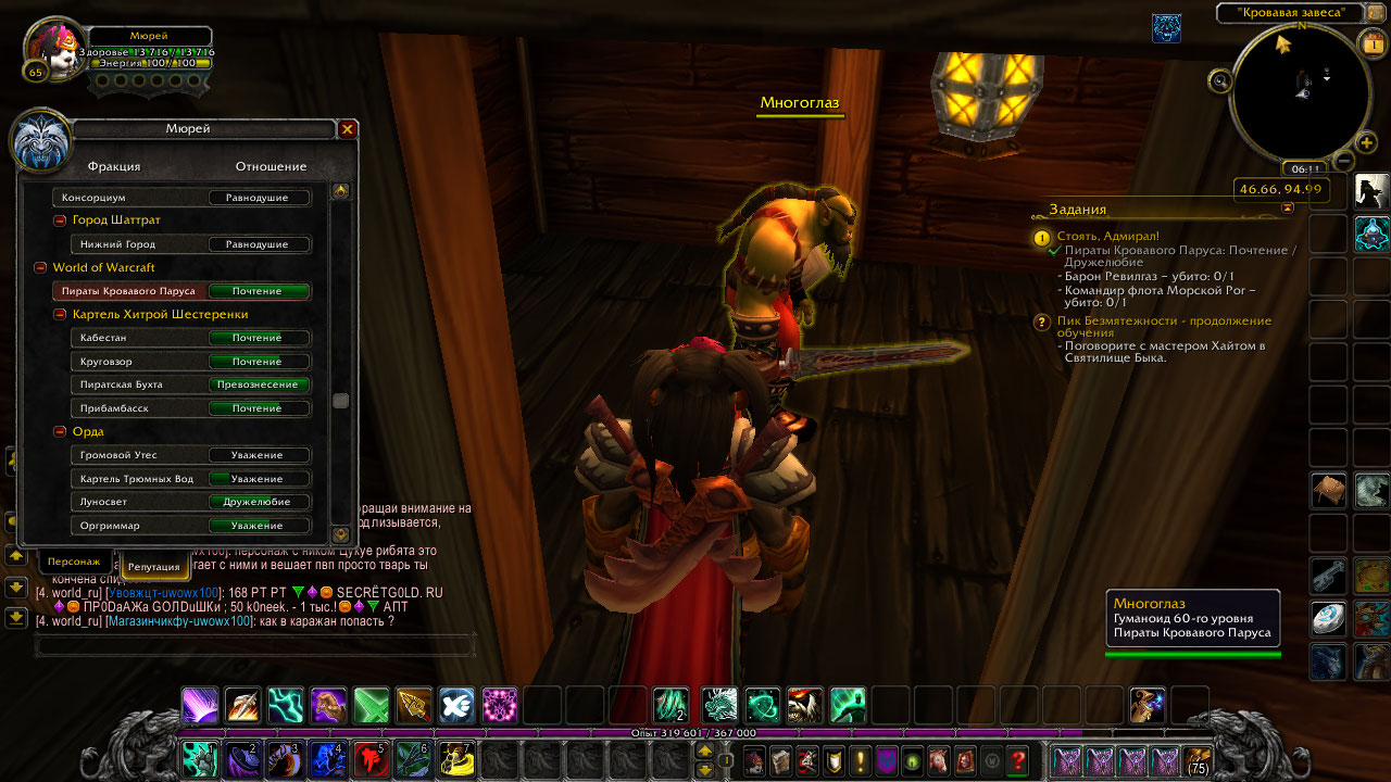 | Description | Попал в затруднительное положение с квестом в Пиратской бухте. Если это баг, то почините пож, если я что не так делаю, то подскажите. Судя по всему, здесь проблема с репутацией, но мне непонятно как и куда ее двигать. Мобы, которых надо убить, ко мне дружелюбны, а которые квесты дают стали враждебные. Многоглаз стал враждебный и не дает квест Пушка старушка, а барон Ревилгаз и Морской рог стали зеленые и не агрятся. Режим пвп не помог. | ||||