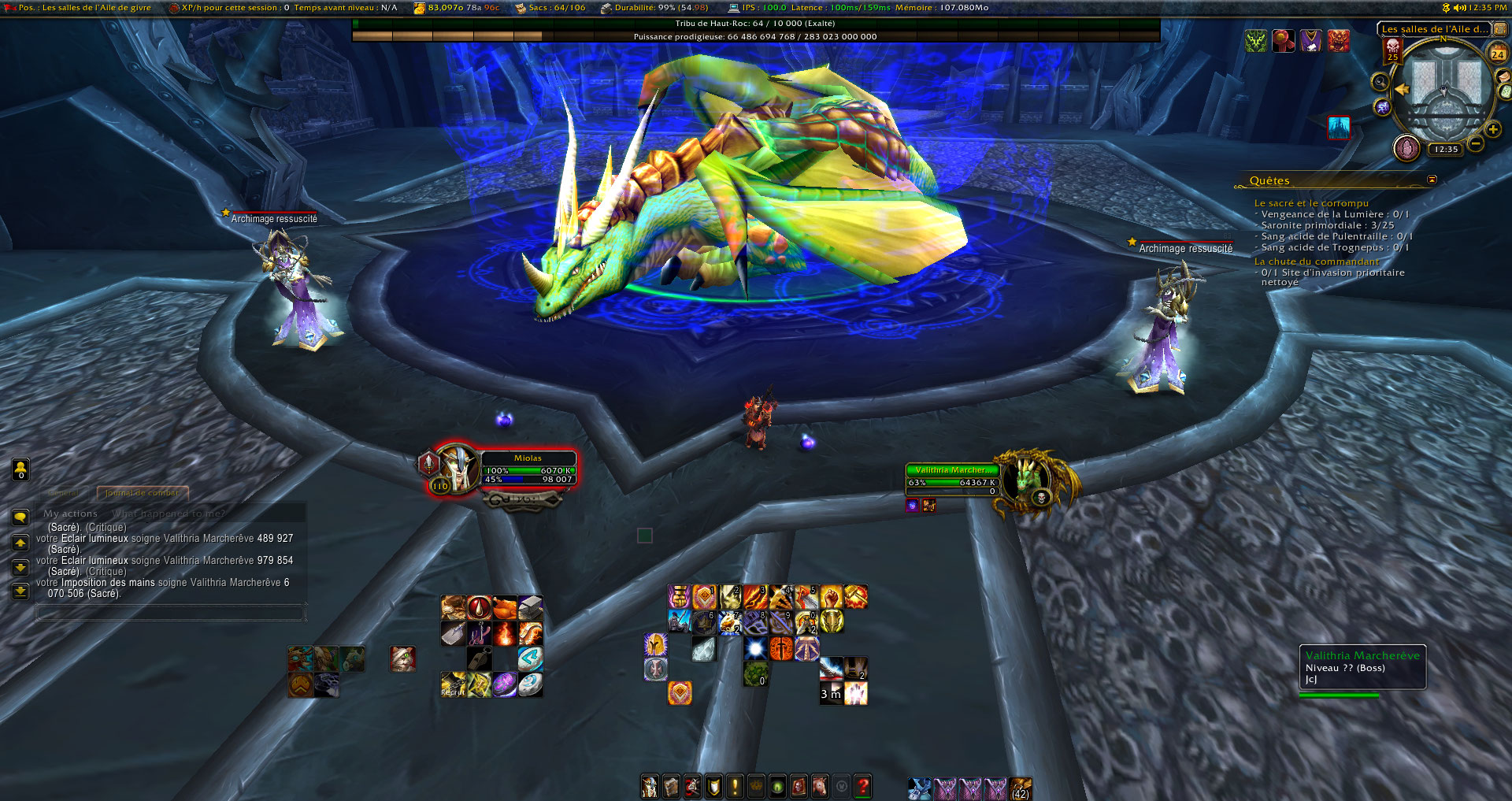 | Description | Les heals qu'on envoient ne sont pas comme ils devraient être. c'est à dire que je devrais passer le boss soit après une impositions des mains ou 3 soins. Mode 10/25 NM/HM De plus, la porte devrait être ouverte pour aller sur Sindragosa. Du coup, je ne peux pas faire ces HF : - La chute du roi-liche (ID 4532 => 10 ; ID 4608 => 25) - Les salles de l'aile de givre (ID 4631 10 HM ; ID 4635 => 25) - Portail à portail (ID 4579 10 ; ID 4619 => 25) A cause de ça, je ne peux pas loot la mascotte sur Syndragosa. Si impossibilité de le résoudre, y a t'il la possibilité de donner les HF et mascotte ? | ||||
