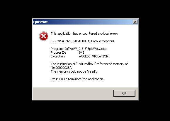 | Description | После релога на одном из персонажей клиент постоянно закрывается с критической ошибкой 132. На остальных персонажах (еще 7 шт) пока все нормально. Отключение аддонов, чистка кеша, воостановление (перенос) персонажа в ЛК домой/кладбище/старт не помогли. Персонаж Обик, ДК, 110, сервер EpicWOW X1. Окно ошибки выскакивает именно на черном фоне, которым сменяется стандартная картинка-заставка локаций Пандарии. | ||||
