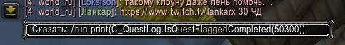 | Description | Выполнял я, значит, цепочку квестов на Силитусе. Беру квест https://ru.wowhead.com/quest=50056/зов-вестника , иду его сдавать Бронзобороду. Сдаю. В результате квест у меня забрали, но он не выполнился. Следующий квест мне взять не дают. ( этот https://ru.wowhead.com/quest=50057/сила-в-наших-руках ). В аддоне показывается, что кв не выполнен. Кв должен браться у того же Бронзоборода, как показано в этом видео https://youtu.be/WhhU3WsgwHU Можно ли мне его как-то заново выдать? Когда ввожу команду с wowhead в ответ тишина /run print(C_QuestLog.IsQuestFlaggedCompleted(50300)) | ||||
