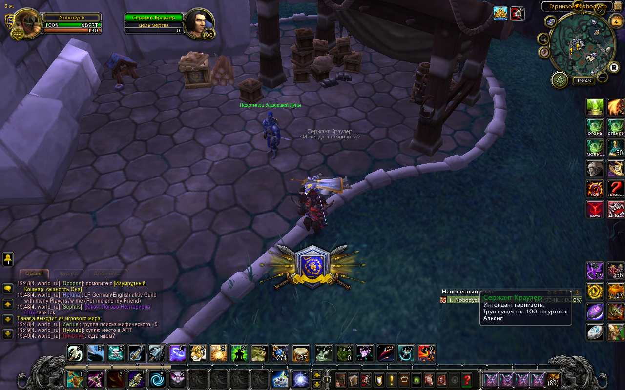 Аналогичным образом умирает сержант в гарнизоне Орды. Показательно, что умирать он начинает незадолго до момента, когда ему нужно сдавать квест. (Новые припасы, вроде бы) Попытка убить или переагрить массовкой моба, который убивает сержанта, не приводит к успеху. Но был момент, когда в процессе выполнения квеста на доступ к шахте гарнизона моб , атакующий сержанта и еще пару нпс в гарнизоне был виден и его можно было сагрить и убить. То есть наблюдается смешение фаз - мобы из этого квеста в фазе выполнения квеста могут и сражаются с нпс Сержант, игрок может взаимодействовать с НПС Сержант, пока он жив, но взаимодействие с мобами невозможно. Возможно, я ошибаюсь с фазой и мобами, хочу как лучше. |