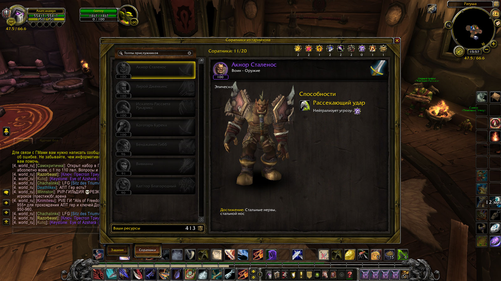 | Description | В дренорском гарнизоне собирал соратников на задания (так чтобы их умения максимально помогали в выполнении заданий)ну и Для получения соратника нужно было пройти Шлаковые шахты-рейд с выполнением определенных условий.Рейд то я прошел и условия выполнены потому как достижение получено персонажем-https://ru.wowhead.com/achievement=8929/%D1%81%D1%82%D0%B0%D0%BB%D1%8C%D0%BD%D1%8B%D0%B5-%D0%BD%D0%B5%D1%80%D0%B2%D1%8B-%D1%81%D1%82%D0%B0%D0%BB%D1%8C%D0%BD%D0%BE%D0%B9-%D0%BD%D0%BE%D1%81 на скрине это прекрасно видно.Но обида ссаная -Соратник так и не пришел в гарнизон на скрине это тоже отмечено -ОН НЕПОЛУЧЕН этим персонажем.И как быть ? пробовал через Дебагера решить прописывая ID-достижения или соратника(8929 и 255)-просто выбрасывает из игры но успевает отметить что достижение полученно сообщением. | ||||