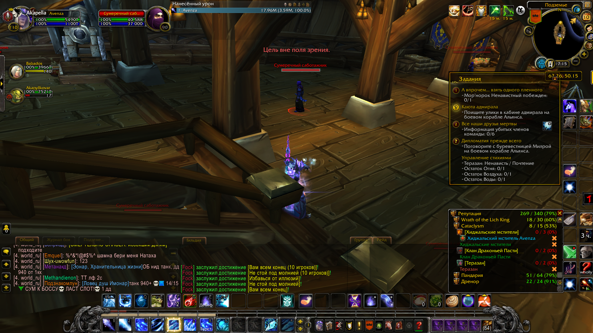 | Description | Проблема в том, что нужно поговорить с https://ru.wowhead.com/npc=42684/%D0%B1%D1%83%D1%80%D0%B5%D0%B2%D0%B5%D1%81%D1%82%D0%BD%D0%B8%D1%86%D0%B0-%D0%BC%D0%B8%D0%BB%D1%80%D0%B0 на корабле Альянса, который кружит по Подземью, а она не кликабельна. Когда корабль прилетает в определенную точку, с ней можно поговорить, но вот ни сдать квест, ни получить новые обычному человеку не получится, так как промежуток времени для этого около 0.5 секунды. Если и получается взять у нее квесты, то их выполнить невозможно, так как нужно убивать мобов, которые находятся на корабле, а когда юзаешь спеллы на них, пишет либо "Цель вне поле зрения", либо "Вне зоны действия". Даже если к ним подойти в плотную и атаковать рукой, то ничего не происходит. | ||||