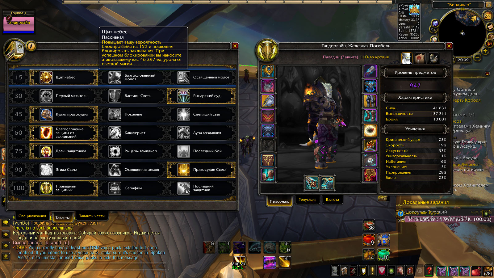 Здравствуйте! После выбора таланта https://ru.wowhead.com/spell=152261 вероятность блокирования не влияет на шанс, как и вы описали, подтверждаю. После прокачки оплота на 2ую легу, шанс блока дропнулся до 23% (проверю отпишу отдельный репорт) |