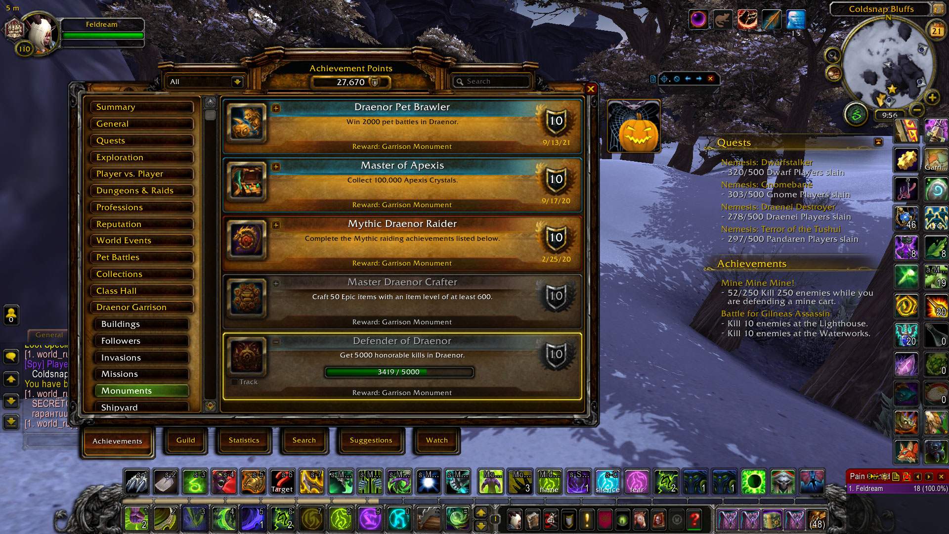 As shown on the screenshot i already have taken https://www.wowhead.com/quest=36924/nemesis-dwarfstalker https://www.wowhead.com/quest=36926/nemesis-gnomebane https://www.wowhead.com/quest=36930/nemesis-draenei-destroyer and the rest pvp quest from https://www.wowhead.com/npc=86629/razakul at https://www.wowhead.com/building=159/gladiators-sanctum Even if Ashran battlegound doesn't work right now and players in Draenor are few in number PvP there is still doable. But https://www.wowhead.com/item=118043/broken-bones don't drop for sure. |
