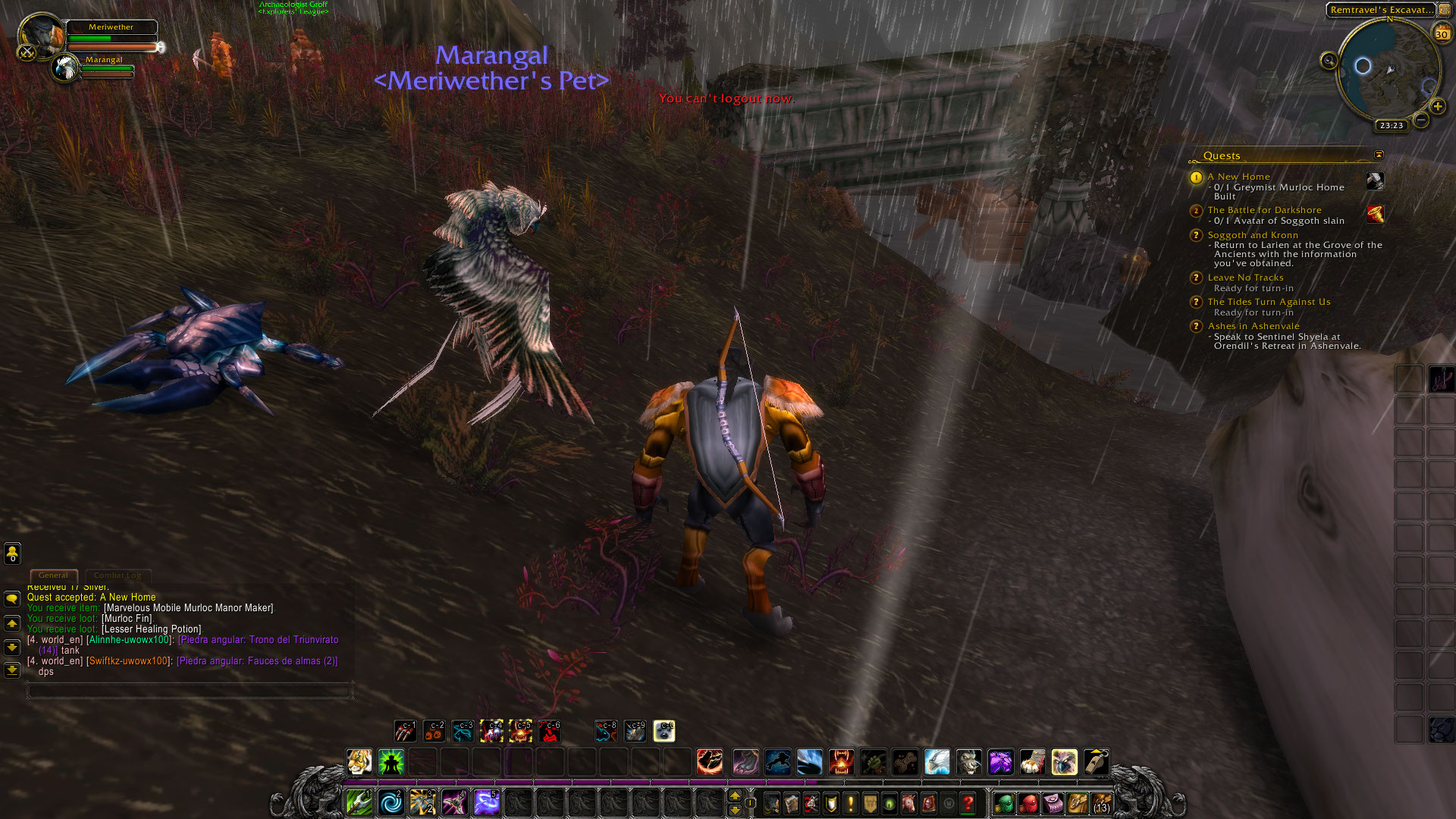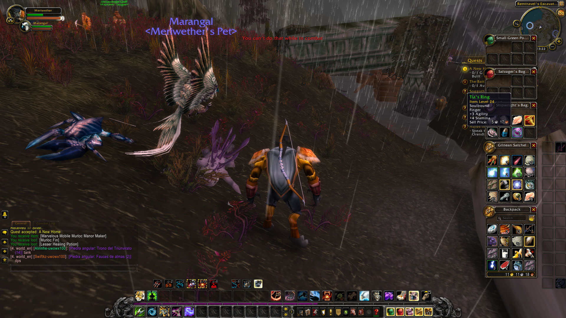 | Description | I've been playing on this server for a few days, and this happens all the time. After fighting a mob, my character gets stuck in combat mode. This prevents me from regaining health at faster rate, changing equipment, or using travel via Flight master. It is very frustrating to have to Alt+F4 every time I find a piece of equipment, or want to do something. You will see in screenshots that I can't equip ring from my inventory, or log out. My portrait is not red, since I was not in combat. | ||||
