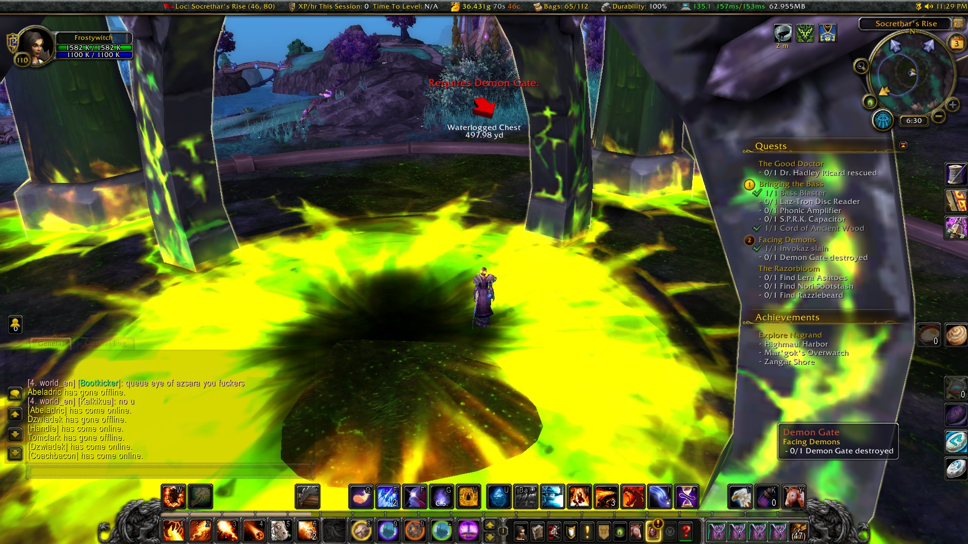 | Description | Southwest corner of Shadowmoon Valley, a quest given by Anchorite Laanda, a quest called "Facing Demons". You have to kill Invokaz, then "Demon Gate Destroyed". You can kill Invokaz and get credit for it fine, but, you cannot "destroy" the demon gate. All you're supposed to do is click the gate and it should destroy itself, but it doesn't work. It gives the error message "Requires Demon Gate" even when you're standing right on the proper area. You can't finish the quest chain.. | ||||