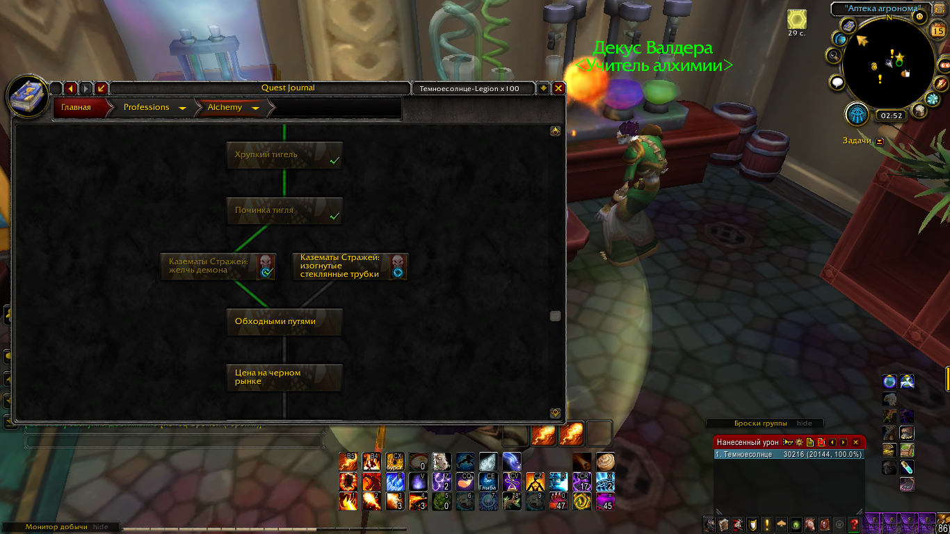 | Description | При выполнении линейки квестов на алхимию легиона, после выполнения задания "Казематы стражей: Желчь демона" и "Казематы стражей: изогнутые стеклянные трубки" должно идти задание "Обходными путями", но Декус Валдера не выдает данное задание. Скриншот с выполенным квестом на трубки(точней что эти трубки уже есть у данного НПС) приложен, а так же скриншот с аддона по квестам | ||||