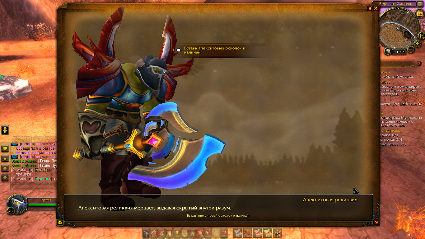 | Steps To Reproduce | 1. Взять квест 2. Добыть апекситовый осколок 3. Поговорить с Апекситовой Реликвией 4. Отдать апекситовый осколок | ||||