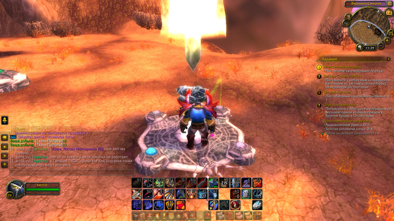 | Description | Квест можно взять у Чу'а'лора, в Огри'ле, в Острогорье, Запределье После активации кристалла с названием "Апекситовая реликвия" игрок должен выбрать все цветные камни в последовательности указаной кристаллом, но т.к квест забаган - игрок не может прожимать камни и спустя несколько секунд персонаж игрока умирает от "Кара Апекситового кристалла" | ||||
