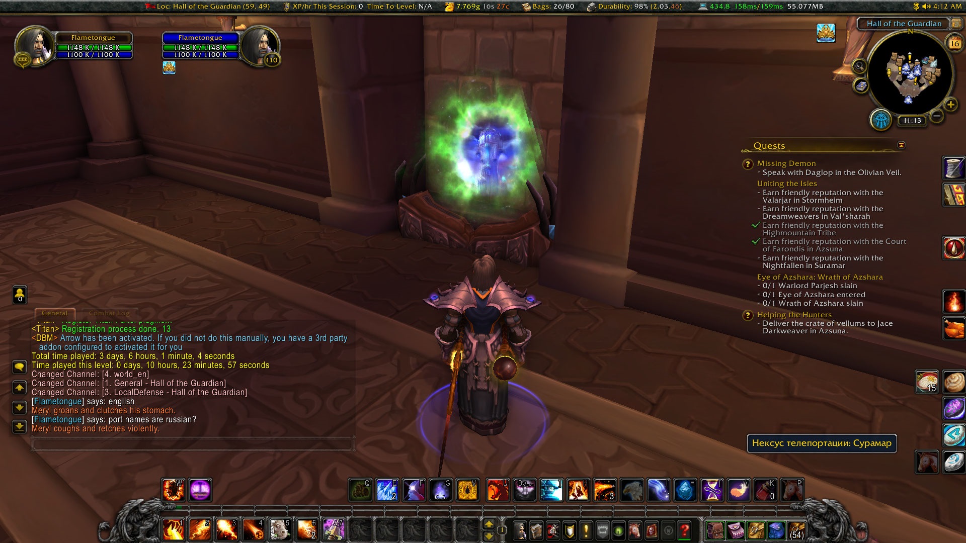 | Description | I use English language in the client because I am American, I speak English. I read English. However, my "Teleportation Nexus" portals in the Mage Class Hall show up as Russian text for each portal. I cannot read Russian. This may get fixed in future patches, I don't know. Hopefully it will. | ||||