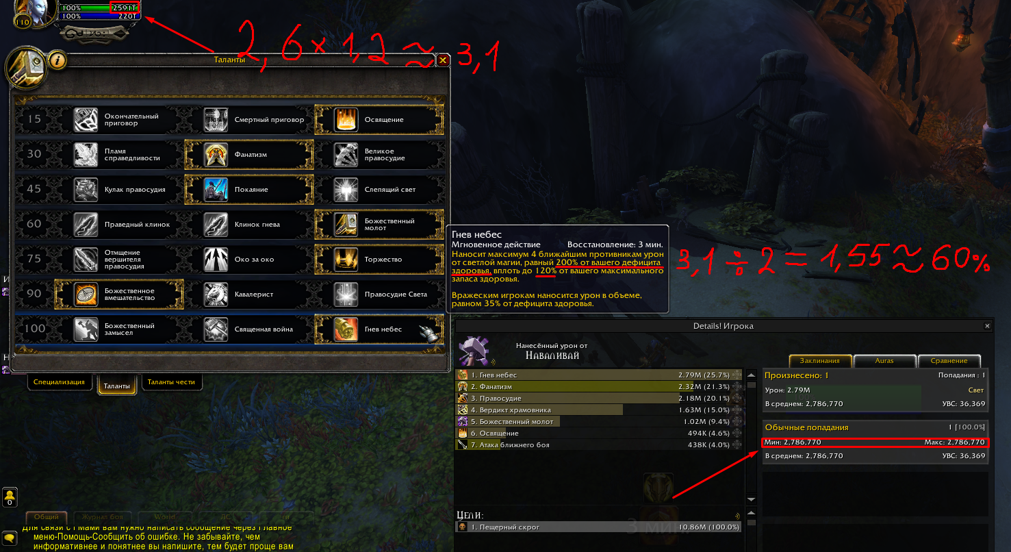 | Additional Information | При наличии здоровья 2.6м, талант должен наносить примерно 3.1м урона в 1 цель(120%), и 200% дифицита, это 3.1 / 2 = 1.55м, что примерно равно 60%, при опускании здоровья до 10% я наношу урон только 2.7м урона(этот урон почему-то можно парировать). При наличии крита 34% урон не критует(брал пак по 3 моба за 8 попыток ни одного крита), хотя должен.и Прикрепил скрин с цифрами аддона "details" | ||||