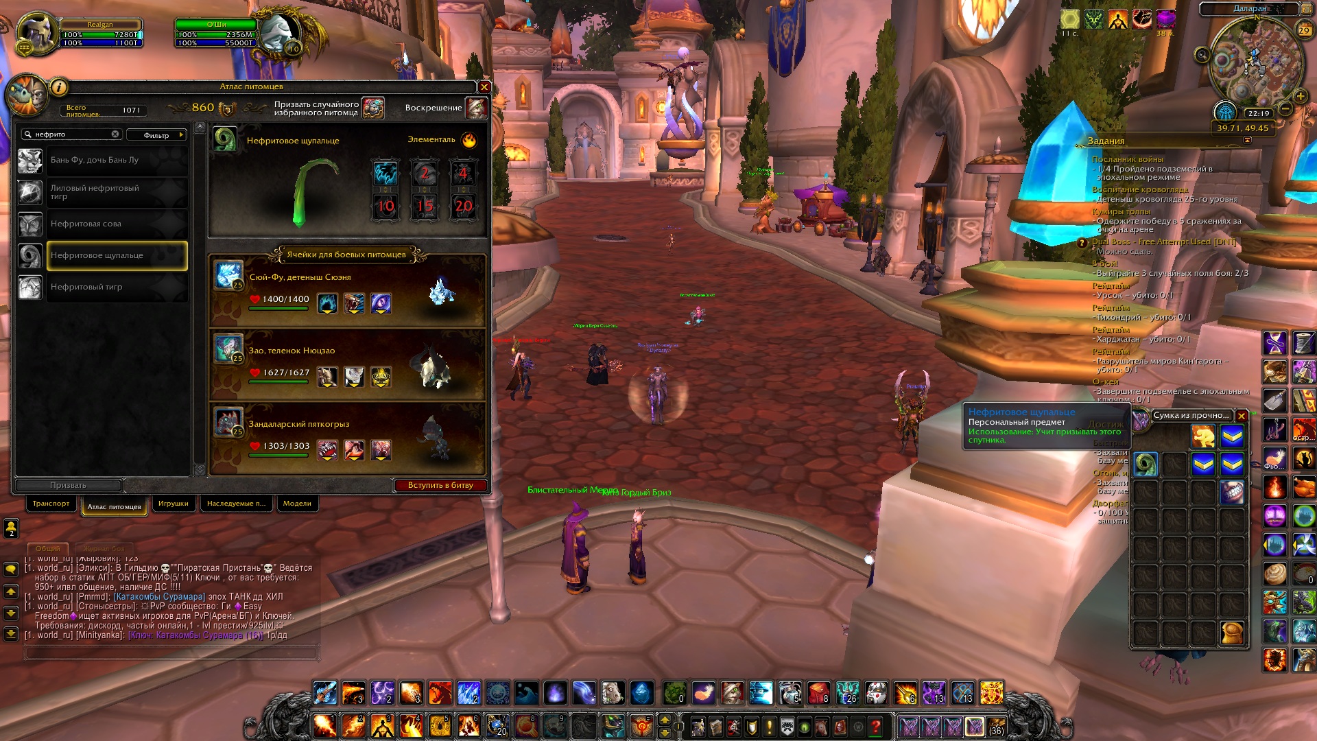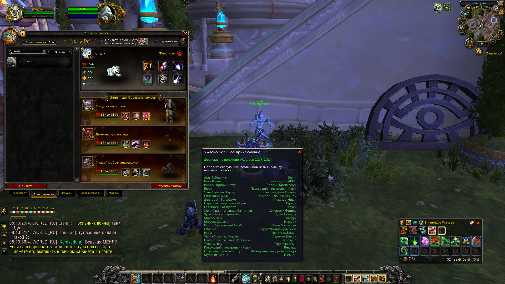 Добавлю свои пять копеек. https://ru.wowhead.com/item=120121 за выполненное достижение https://ru.wowhead.com/achievement=9069 из темы http://tracker.legionbugs.com/view.php?id=9935 Его также добавили в Дебагера, но пэт не появляется в списке питомцев. |