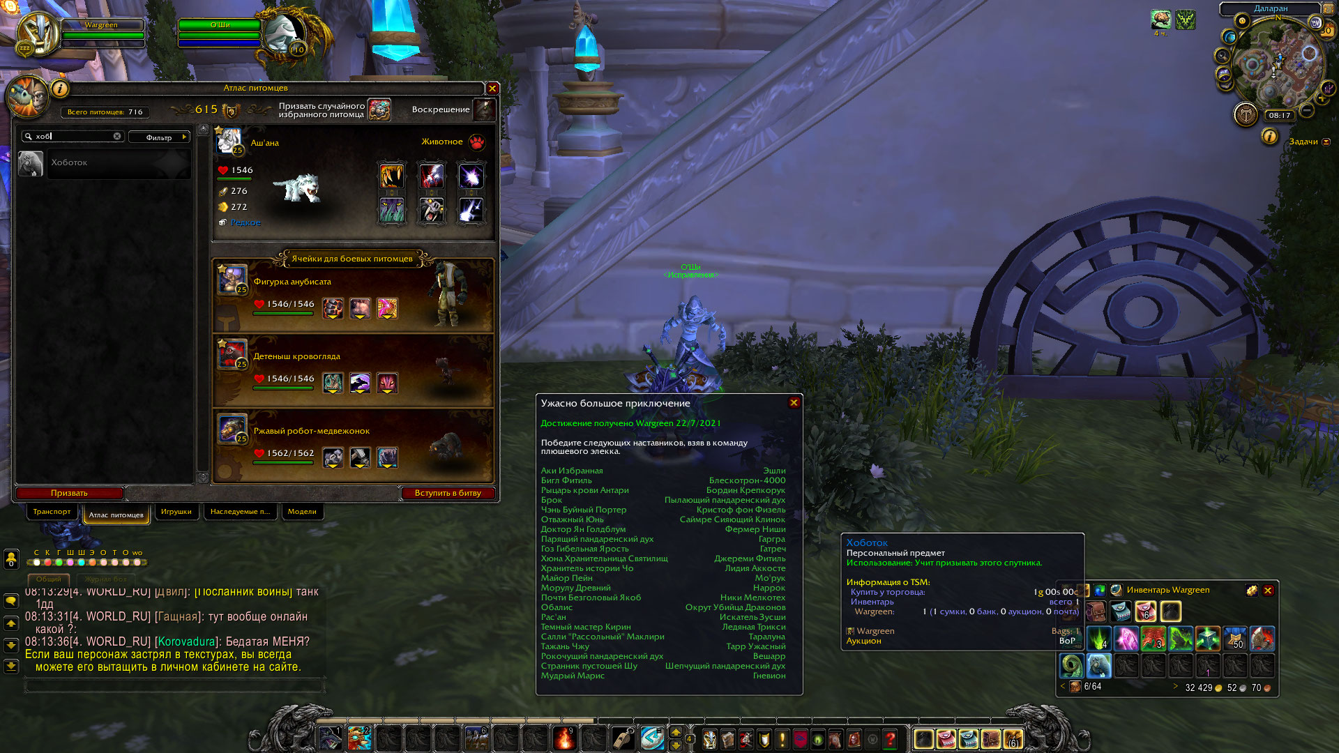 Добрый день, благодарю за сообщение. В какой период вы использовали https://ru.wowhead.com/item=89686/ ? После того как его добавили НПС Дебагер? Покупали у Дебагера? Достижение https://ru.wowhead.com/achievement=7521 у вас выполнено? |