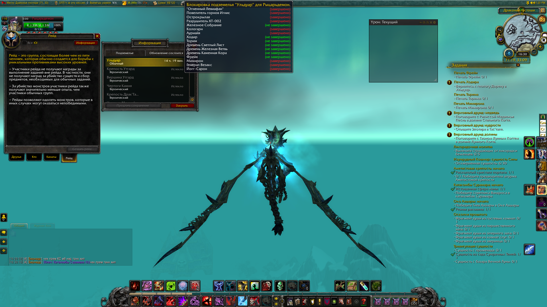 | Description | Доброго дня! пронес ульду, заметил следующие ошибки: не было лута с фрейи и мимирона. не всех боссов засчитало убитыми, на скрине видно(не убивал только древней). ошибка по квестам в ульдуре на сбор печатей. 13611 печать мимирона, 13606 печать фрейи, 13610 печать торима не выпали. 13609 печать ходира упала) | ||||