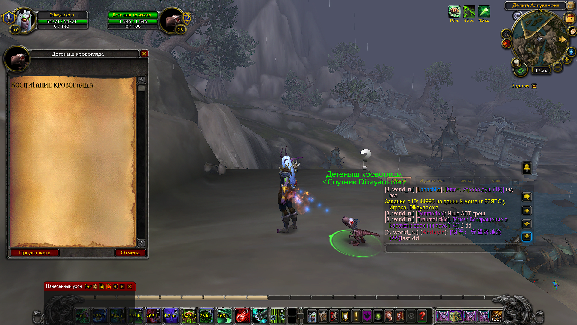 Добрый день, призовите питомца кровогляда и попросите ГМ в игре прописать на вашего персонажа Дикаяохота .quest complete 44990 потом сообщите получилось сдать задание или нет. |