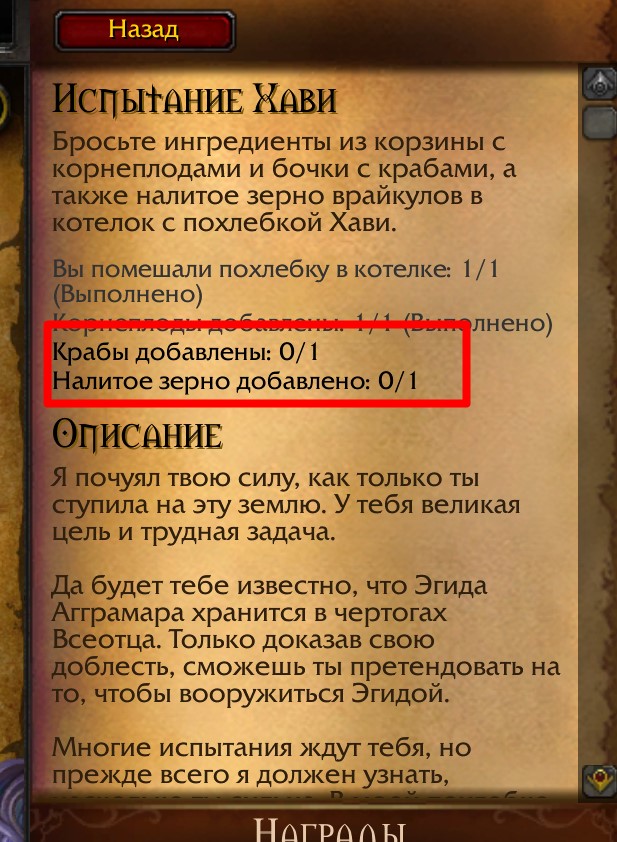 | Description | При выполнении задания "Испытание Хави" не зачитываются ингредиенты. Помогите с данной проблемой. Если сразу нажать на котел то зачитываются первых 2 пункта квеста (скрин приложен). Ник в игре Цирик. | ||||