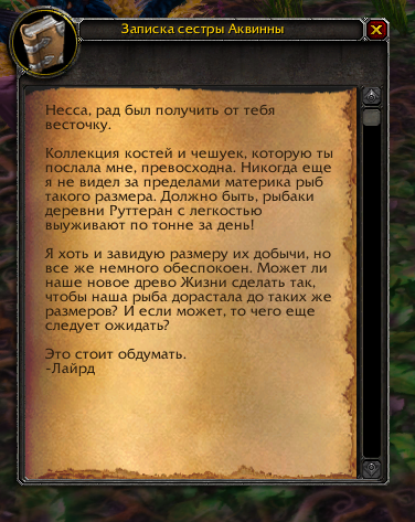 | Description | Присутствует текст из другого свитка/книги. Квесты: https://ru.wowhead.com/quest=6342 + https://ru.wowhead.com/quest=6343 Итем: https://ru.wowhead.com/item=16263 Должно быть: "Ньома! Ты просто не представляешь, как я обрадовалась этой книге рецептов! Все описанные там блюда именно такие, какими я их помню. Хочу как можно скорее попробовать новые рецепты. Если будет время, обязательно приезжай ко мне в Дарнас, приготовлю что-нибудь вкусненькое. Твоя подруга, Аквинна" | ||||