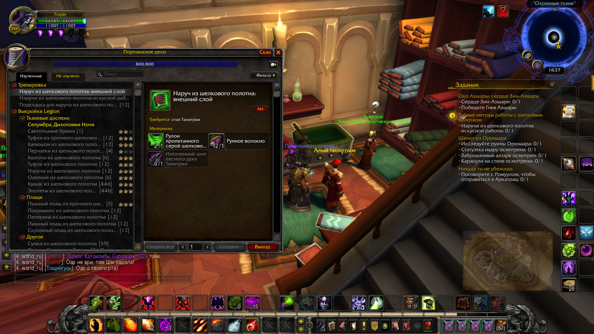 | Description | Здравствуйте! Забагался квест "Тайные методы по работе с шелковым полотном" по профессии "Портняжное дело". А именно: По квесту надо сделать "Наручи из шелкового полотна искусной работы". Все необходимые квестовые предметы берутся либо в лавке у портного либо у кузнеца. По квесту нужен предмет "Наточенный шип лесного духа Танитрии", который берется из ящика ряд с чанами для окрашивания в лавке портного в Даларане. Так вот в чем собственно проблема. При клике на ящик ничего не происходит. Ящик просто исчезает, квестовый предмет не появляется в рюкзаке. Все остальные нужные предметы для задания берутся нормально. Соответственно квест я выполнить не могу. Пробовал уже много раз, всегда одно и тоже. Релог, чистка WTF, Cashe и т.д. я пробовал, квест отменял и снова брал. все одно и тоже. Прошу исправить | ||||