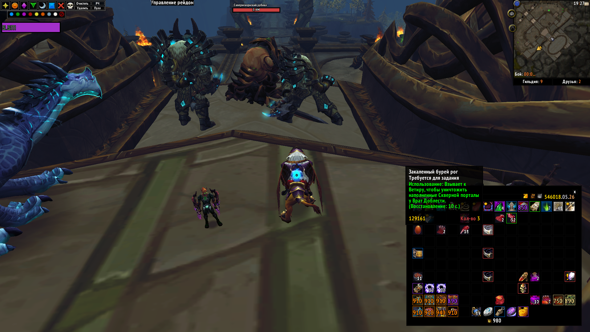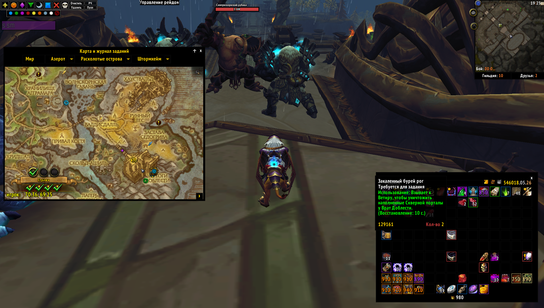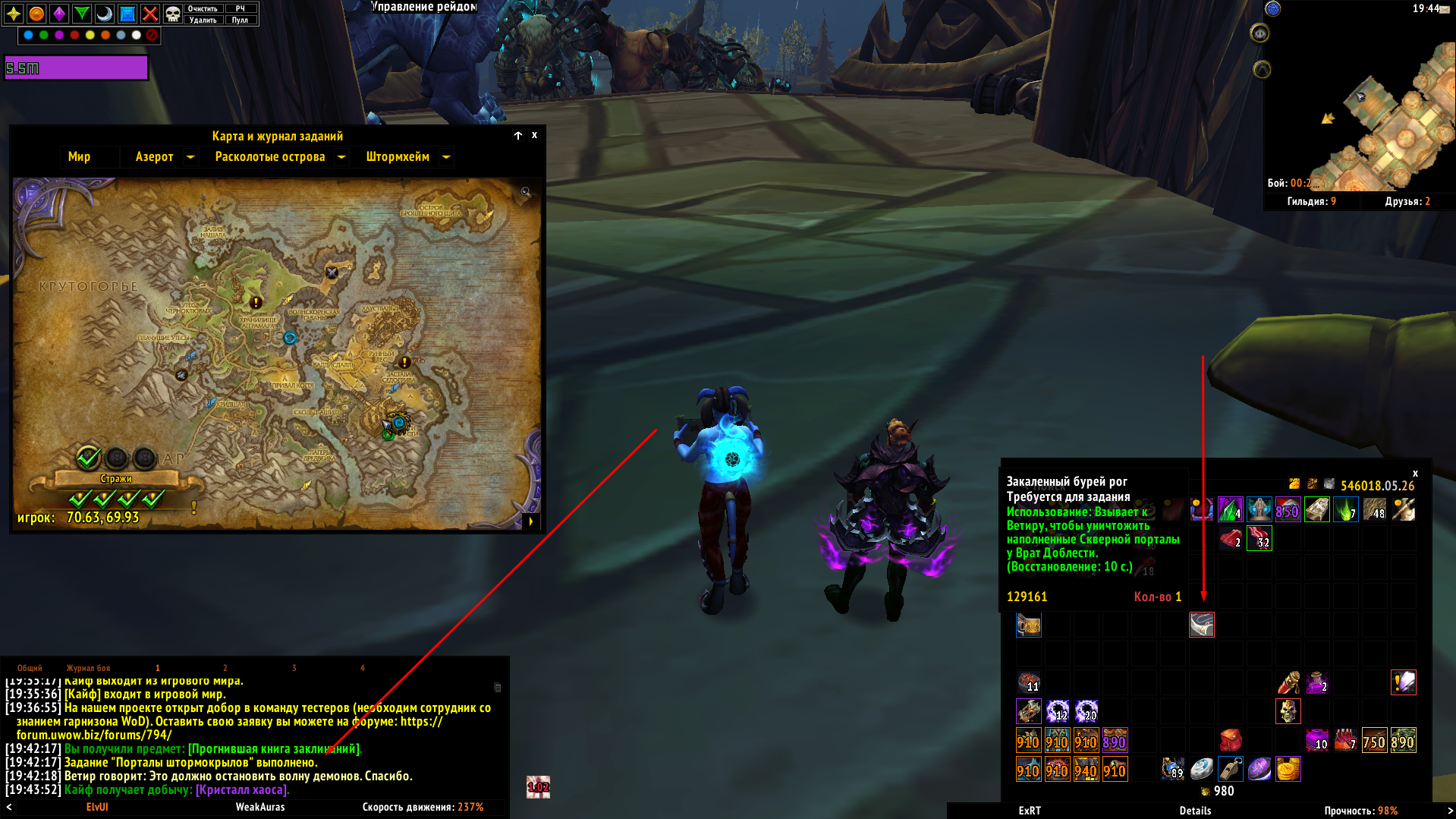 | Description | задание - https://ru.wowhead.com/quest=43827/%D0%BF%D0%BE%D1%80%D1%82%D0%B0%D0%BB%D1%8B-%D1%88%D1%82%D0%BE%D1%80%D0%BC%D0%BE%D0%BA%D1%80%D1%8B%D0%BB%D0%BE%D0%B2 при посещении "зоны квеста" выдают "рог" в инвентарь, чтобы сломать порталы, если во время выполнения задания в зоне перезайти на персонажа - то добавят еще один рог, и еще один, я "нафармил" себе 3 рога, но я уверен что можно сделать еще. повторил баг на обоих персонажах. | ||||