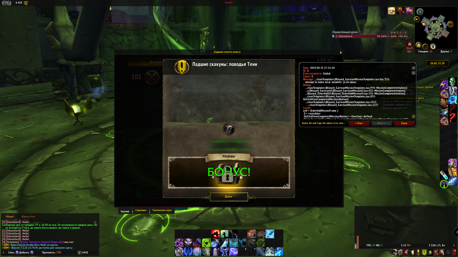 и еще при открытие стола заданий аддон выдает такое сообщение Date: 2019-05-05 14:48:28 ID: 1 Error occured in: Global Count: 1 Message: ...risonTemplates\Blizzard_GarrisonMissionTemplates.lua line 974: attempt to index local 'animInfo' (a nil value) Debug: ...risonTemplates\Blizzard_GarrisonMissionTemplates.lua:974: MissionCompleteInitialize() ...s\Blizzard_GarrisonUI\Blizzard_GarrisonMissionUI.lua:453: MissionCompleteInitialize() ...Blizzard_OrderHallUI\Blizzard_OrderHallMissionUI.lua:376: MissionCompleteInitialize() ...risonTemplates\Blizzard_GarrisonMissionTemplates.lua:835: OnClickViewCompletedMissionsButton() ...risonTemplates\Blizzard_GarrisonMissionTemplates.lua:2332: ...risonTemplates\Blizzard_GarrisonMissionTemplates.lua:2327 Locals: self = OrderHallMissionFrame { 0 = <userdata> OnClickViewCompletedMissionsButton = <function> defined @Interface\AddOns\Blizzard_GarrisonTemplates\Blizzard_GarrisonMissionTemplates.lua:817 OnDragStartMissionFollower = <function> defined @Interface\AddOns\Blizzard_GarrisonTemplates\Blizzard_GarrisonMissionTemplates.lua:751 followerXPTable = <table> { } OnLoadMainFrame = <function> defined @Interface\AddOns\Blizzard_OrderHallUI\Blizzard_OrderHallMissionUI.lua:22 NextMission = <function> defined @Interface\AddOns\Blizzard_GarrisonTemplates\Blizzard_GarrisonMissionTemplates.lua:838 SetupCompleteDialog = <function> defined @Interface\AddOns\Blizzard_OrderHallUI\Blizzard_OrderHallMissionUI.lua:356 SetupMissionList = <function> defined @Interface\AddOns\Blizzard_OrderHallUI\Blizzard_OrderHallMissionUI.lua:183 CheckCompleteMissions = <function> defined @Interface\AddOns\Blizzard_GarrisonUI\Blizzard_GarrisonMissionUI.lua:432 TopBorder = <unnamed> { } Bottom = <unnamed> { } ShowMissionStage = <function> defined @Interface\AddOns\Blizzard_OrderHallUI\Blizzard_OrderHallMissionUI.lua:257 BotRightCorner = <unnamed> { } SetEnemies = <function> defined @Interface\AddOns\Blizzard_OrderHallUI\Blizzard_OrderHallMissionUI.lua:345 followerMaxQuality = 6 OnDragStopFollowerButton = <function> defined @Interface\AddOns\Blizzard_GarrisonTemplates\Blizzard_GarrisonMissionTemplates.lua:745 UpdateMissionParty = <function> defined @Interface\AddOns\Blizzard_GarrisonUI\Blizzard_GarrisonMissionUI.lua:377 MissionCompleteBackground = <unnamed> { } OnEventMainFrame = <function> defined @Interface\AddOns\Blizzard_OrderHallUI\Blizzard_OrderHallMissionUI.lua:115 RightBorder = <unnamed> { } UpdateRewards = <function> defined @Interface\AddOns\Blizzard_GarrisonUI\Blizzard_GarrisonMissionUI.lua:678 UpdateStartButton = <function> defined @Interface\AddOns\Blizzard_GarrisonTemplates\Blizzard_GarrisonMissionTemplates.lua:477 HasMission = <function> defined @Interface\AddOns\Blizzard_GarrisonTemplates\Blizzard_GarrisonMissionTemplates.lua:99 ClearMouse = <function> defined @Interface\AddOns\Blizzard_GarrisonUI\Blizzard_GarrisonMissionUI.lua:406 OnClickFollowerPlacerFrame = <function> defined @Interface\AddOns\Blizzard_GarrisonTemplates\Blizzard_GarrisonMissionTemplates.lua:716 TopRightCorner = <unnamed> { } SetMissionCompleteNumEncounters = <function> defined @Interface\AddOns\Blizzard_GarrisonTemplates\Blizzard_GarrisonMissionTemplates.lua:1064 MissionTab = <unnamed> { } OnShowMainFrame = <function> defined @Interface\AddOns\Blizzard_OrderHallUI\Blizzard_OrderHallMissionUI.lua:191 SetPartySize = <function> defined @Interface\AddOns\Blizzard_GarrisonUI\Blizzard_GarrisonMissionUI.lua:224 ResetMissionCompleteEncounter = <function> defined @Interface\AddOns\Blizzard_GarrisonUI\Blizzard_GarrisonMissionUI.lua:478 Tab1 = OrderHallMissionFrameTab1 { } SelectTab = <function> defined @Interface\AddOns\Blizzard_OrderHallUI\Blizzard_OrderHallMissionUI.lua:220 FollowerList = OrderHallMissionFrameFollowers { } GetMissionPage = <function> defined @Interface\AddOns\Blizzard_OrderHallUI\Blizzard_OrderHallMissionUI.lua:243 OnClickMissionTutorialButton = <function> defined @Interface\AddOns\Blizzard_GarrisonUI\Blizzard_GarrisonMissionUI.lua:556 Tab3 = OrderHallMissionFrameTab3 { } TitleText = <unnamed> { } OnHideMainFrame = <function> defined @Interface\AddOns\Blizzard_OrderHallUI\Blizzard_OrderHallMissionUI.lua:201 BackgroundTile = <unnamed> { } SetupTabs = <function> defined @Interface\AddOns\Blizzard_OrderHallUI\Blizzard_OrderHallMissionUI.lua:127 lastUpdate = 18004.906 UpdateMissionData = <function> defined @Interface\AddOns\Blizzard_OrderHallUI\Blizzard_OrderHallMissionUI.lua:295 followerQualityTable = <table> { } followerMaxLevel = 110 OnSetEnemy = <function> defined @Interface\AddOns\Blizzard_OrderHallUI\Blizzard_OrderHallMissionUI.lua:303 spilloverBuffs = <table> { } abilityCountersForMechanicTypes = <table> { } materialAmount = 4034 OnDragStartFollowerButton = <function> defined @Interface\AddOns\Blizzard_G AddOns: Swatter, v7.0.5 (<%codename%>) Auctionator, v4.0.19 BigDebuffs, vv6.4 CoolLine, v6.2.002 CrucibleWeight, v18 DBMCore, v7.3.21 DBMDefaultSkin, v DBMPartyLegion, v DBMStatusBarTimers, v DejaCharacterStats, v730rc108 Details, v DetailsDmgRank, v DetailsDpsTuning, v DetailsEncounterDetails, v DetailsRaidCheck, v DetailsRaidInfoEmeraldNightmare, v DetailsRaidInfoNighthold, v DetailsRaidInfoTombOfSargeras, v DetailsRaidInfoTrialOfValor, v DetailsStreamer, v DetailsTimeAttack, v DetailsTinyThreat, v DetailsVanguard, v ElvUI, v10.72 ElvUIBagFilter, v3.2 ElvUICliqueDatatext, v1.08 ExRT, v3910 GarrisonMissionManager, vv55 GottaGoFast, v26600 GottaGoFastHistory, v26600 HandyNotes, vv1.4.15 HandyNotesArgus, v0.20.0 HandyNotesDraenorTreasures, v1.20a HandyNotesLegionRaresTreasures, v1.01b HandyNotesLegionTreasures, v1 LibDFramework10, v MasterPlanA, vA NameplateAuras, vr136 Pawn, v2.2.18 RaidAchieveFilter, v1.9.7 RaidAchievement, v RaidAchievementOldModules, v RaiderIO, v7.3.5 (v201802080800) RaiderIODBUSA, v RaiderIODBUSH, v ServerHop, v7.3.0.1 TellMeWhen, v8.4.3 TomTom, vv70300-1.0.0 WeakAuras, v2.5.6 WorldQuestGroupFinder, v0.27 WorldQuestTracker, 