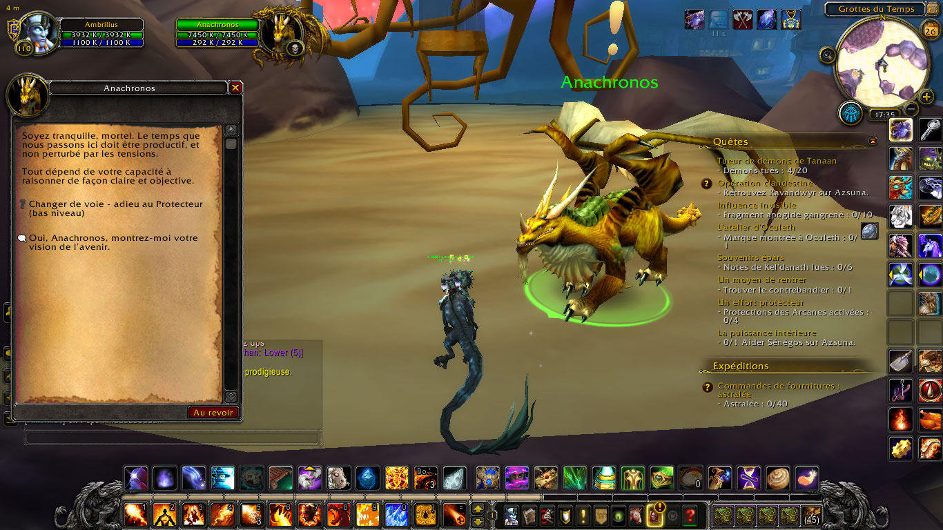 | Additional Information | - link to the legendary cataclysm staff: https://fr.wowhead.com/item=71086/courroux-du-dragon-le-repos-de-tarecgosa - link to the npc anachronos screenshot: https://egammi.com/image/SFqv - link to the missing quest: https://www.wowhead.com/quest=29135/all-seeing-eye - link to the non working object: https://fr.wowhead.com/item=127770/brasero-de-l%C3%A9veil#contained-in-object - link to the non working object screenshot: https://egammi.com/image/SFqT - link to the vale of sands recipe: https://fr.wowhead.com/item=67538/recette-fiole-des-sables - link to the canope vase: https://fr.wowhead.com/item=64657/vase-canope - link to the restored artifact: https://fr.wowhead.com/item=87399/art%C3%A9fact-restaur%C3%A9 - link to the tol'vir fragements crate: https://fr.wowhead.com/item=87539/caisse-de-fragments-arch%C3%A9ologiques-tolvir - link to the alliance vendor articles screenshot: https://egammi.com/image/SFqZ https://egammi.com/image/SFql - link to the horde vendor articles screenshot: https://egammi.com/image/SFqn https://egammi.com/image/SFqs - link to the screenshot of the answer i got: https://egammi.com/image/SFqX От тестера: 1. https://ru.wowhead.com/quest=29132/%D0%BB%D0%B5%D0%B3%D0%B5%D0%BD%D0%B4%D0%B0%D1%80%D0%BD%D0%B0%D1%8F-%D0%BC%D0%B8%D1%81%D1%81%D0%B8%D1%8F Не робит диалог о переносе в Танарис с https://ru.wowhead.com/npc=52408/%D0%BA%D0%BE%D1%80%D1%80%D0%B8%D0%B4%D0%BE%D1%80%D0%BC%D0%B8 - https://egammi.com/image/SF6z Нету квеста https://ru.wowhead.com/quest=29134/%D0%B7%D0%B0%D0%B3%D0%BB%D1%8F%D0%BD%D1%83%D1%82%D1%8C-%D0%B2-%D0%B1%D1%83%D0%B4%D1%83%D1%89%D0%B5%D0%B5#videos-english , но сам диалог с драконом имеется. После диалога должен быть ролик, а у нас его нету. Ролик - https://youtu.be/R-BZkRMRsns . У нас после затемнения экрана, спаунится второй https://ru.wowhead.com/npc=15192/%D0%B0%D0%BD%D0%B0%D1%85%D1%80%D0%BE%D0%BD%D0%BE%D1%81 + спаунится бес https://www.wowhead.com/npc=52605/anachronos-vision-camera-bunny Соответственно нельзя получить квест - https://ru.wowhead.com/quest=29135/%D0%B2%D0%BD%D0%B5%D0%B2%D1%80%D0%B5%D0%BC%D0%B5%D0%BD%D0%BD%D0%BE%D0%B5-%D0%BE%D0%BA%D0%BE Пруфы - https://egammi.com/image/SF67 - https://egammi.com/image/SF61 http://tracker.legionbugs.com/view.php?id=13860 ___________________________ 2. Не робит предмет https://ru.wowhead.com/item=127770/%D0%B6%D0%B0%D1%80%D0%BE%D0%B2%D0%BD%D1%8F-%D0%BF%D1%80%D0%BE%D0%B1%D1%83%D0%B6%D0%B4%D0%B5%D0%BD%D0%B8%D1%8F (персонаж не воскрешается) Пруф - https://egammi.com/image/SF6k ____________________________ | ||||