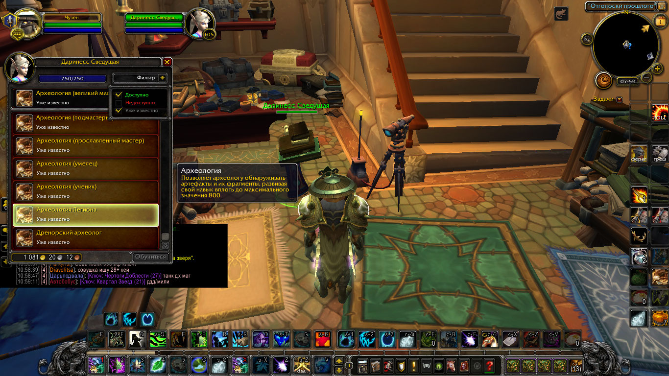 DescriptionАрхеология при первой прокачке в Штормграде у тренера прокачалась до 750 только, больше докачать негде. Все навыки у тренера вкачены, проверил у 3х тренеров в разных городах.