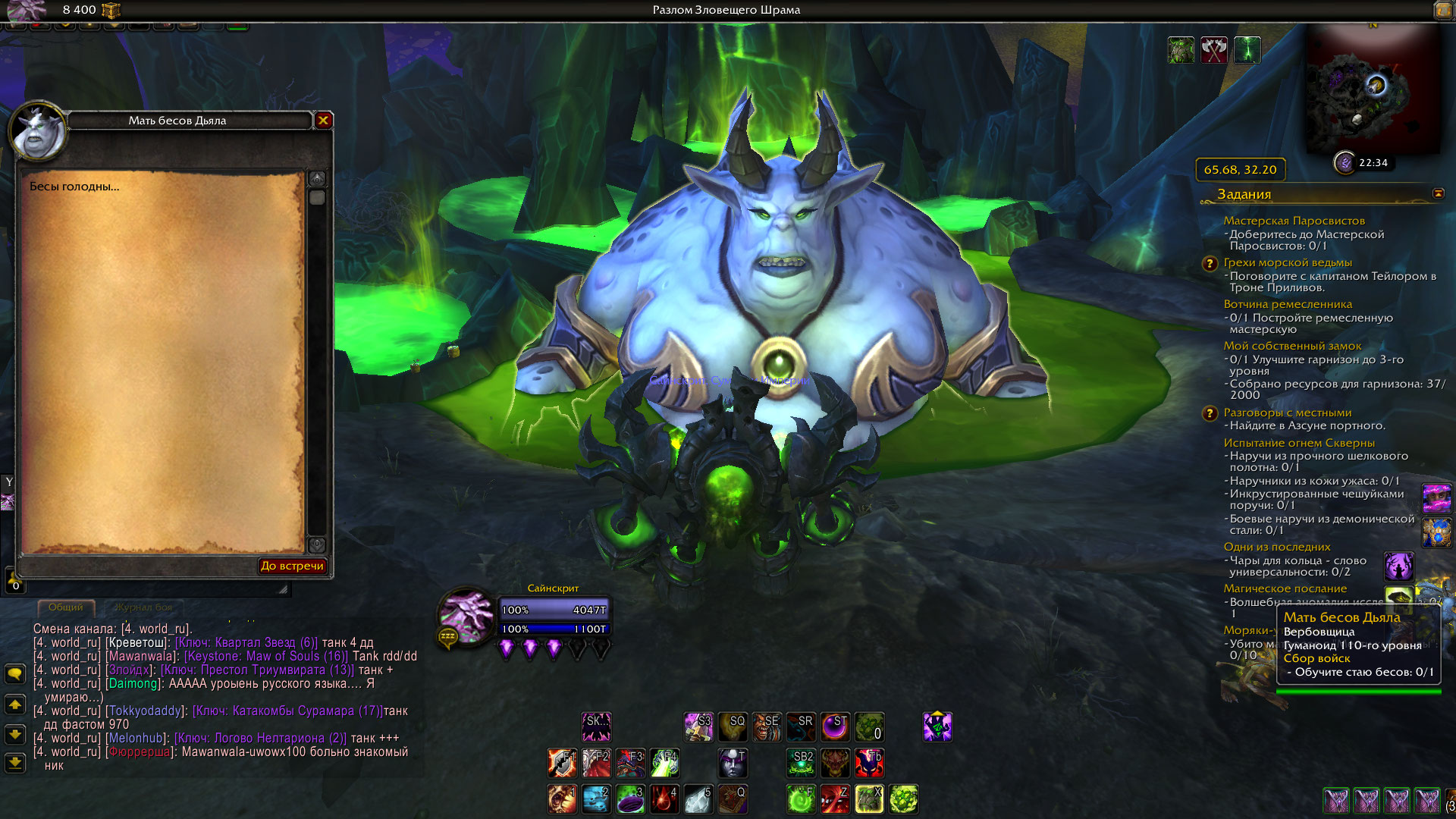 | Description | Не возможно выполнить квест так как при взаимодействии с нпс Мать бесов Дьяла (https://ru.wowhead.com/npc=106216/мать-бесов-дьяла) Открывается просто диалог а не меню с обучением бесов | ||||
