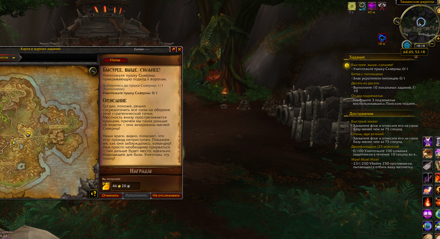 | Description | Здравствуйте, нет возможности выполнить кв https://www.wowhead.com/ru/quest=38444/быстрее-выше-сильнее, нет пушки (скрин), можно ли сделать автокомплит? | ||||