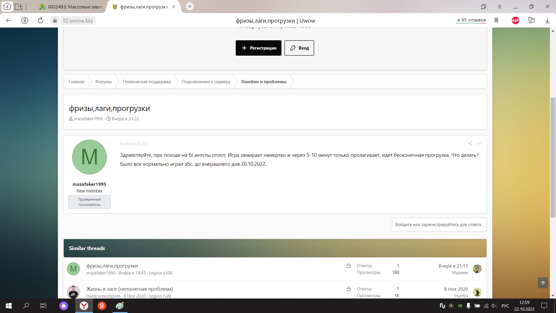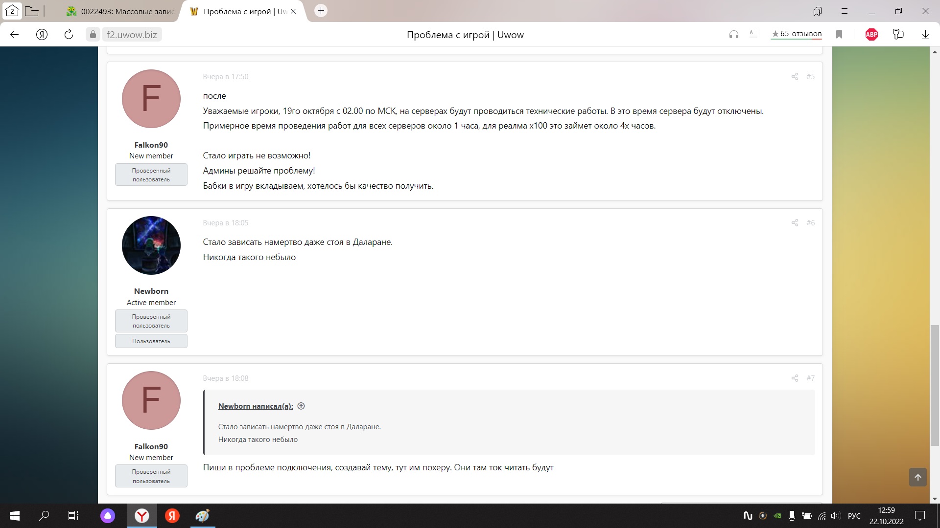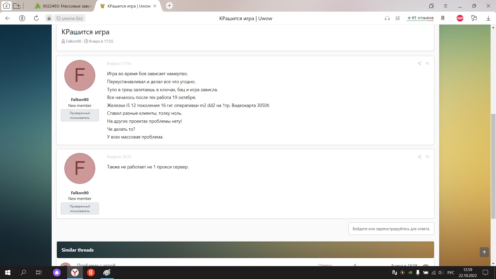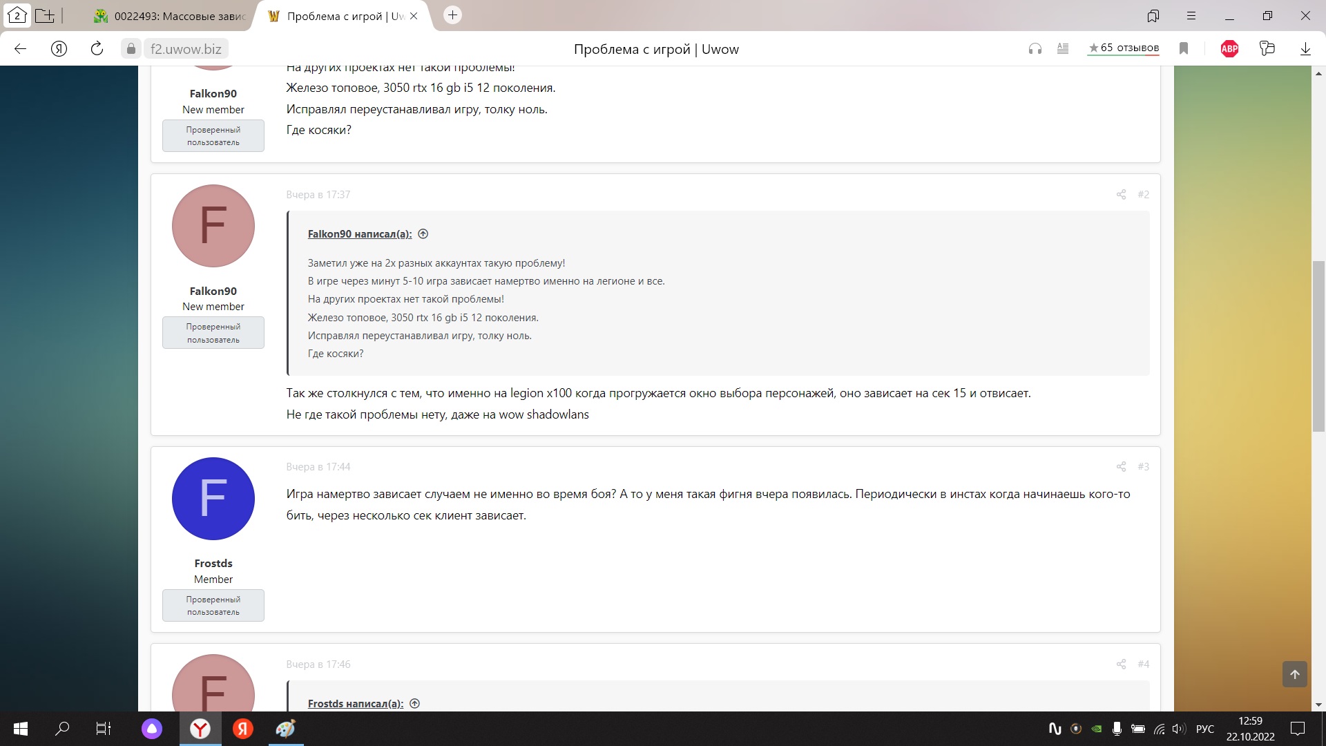 У меня комп за 200к, который в 15 окн будет эту игру запускать, я обьясняю то, что при докачивании файлов даже если так взять. Вов не должен намертво зависать! Там пол форума уже засрано, что игра зависает! Я не один с такой проблемой тут. Вот щас с пк который старый и клиент с 2018 года стоит, запустил игру. Все зависло, клиент докачанный уже давно, в чем проблема то тогда ? У меня мб железо херовое? Или драйвера у меня старые? Обновить нужно? Все время играл нормально, пока вы тех работы не провели 19 октября. |