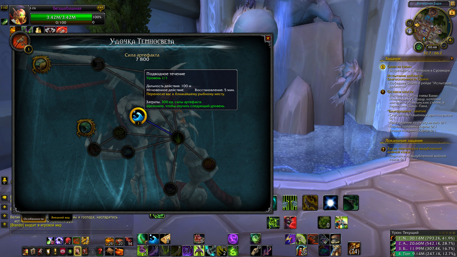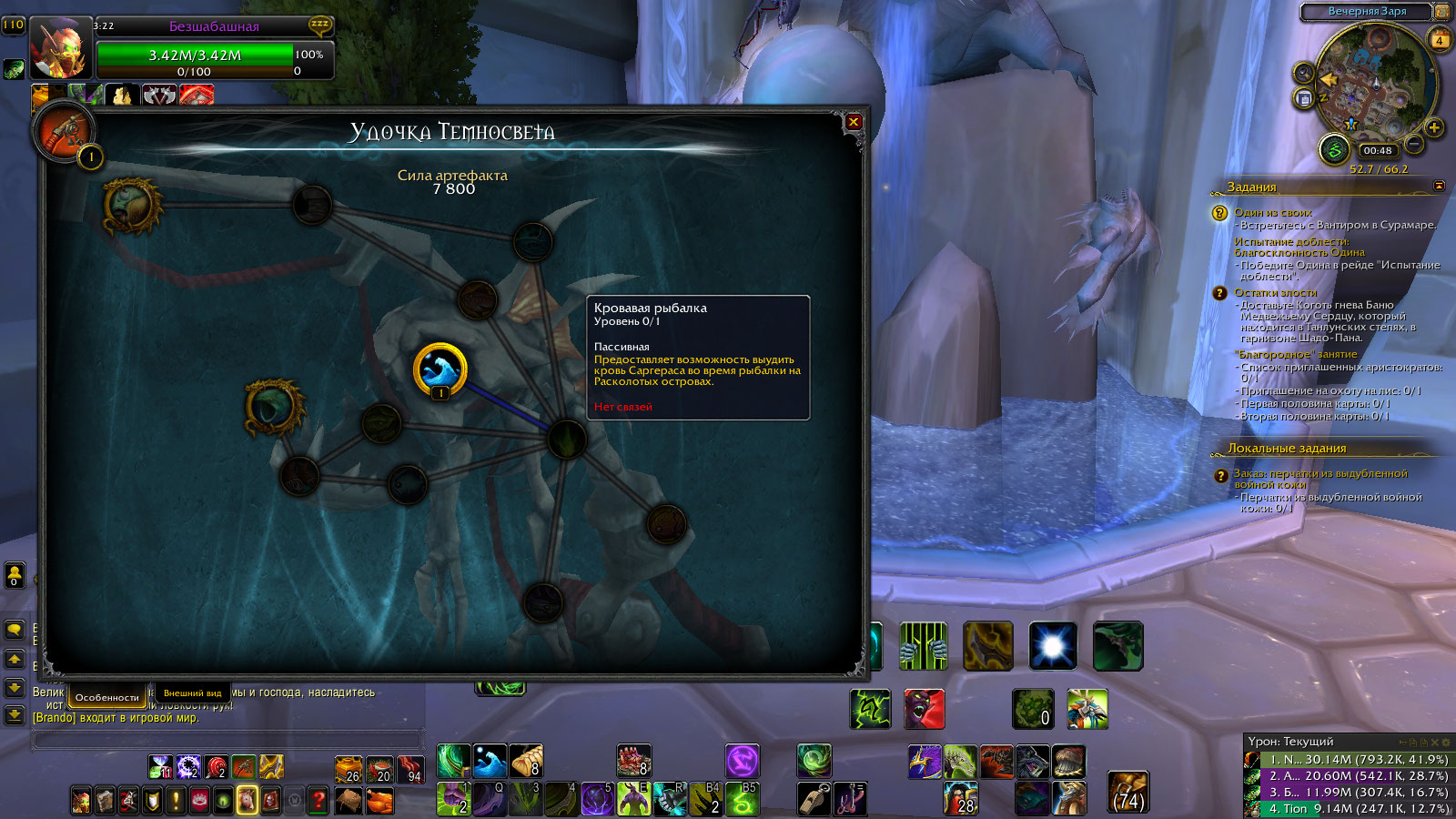 | Description | после получения удочки набрал 7800 силы атефакта, в Даларане подошол к жемчужине,прокачивается только первый талант ( подводное течение ) остальные пишет ( нет связей | ||||