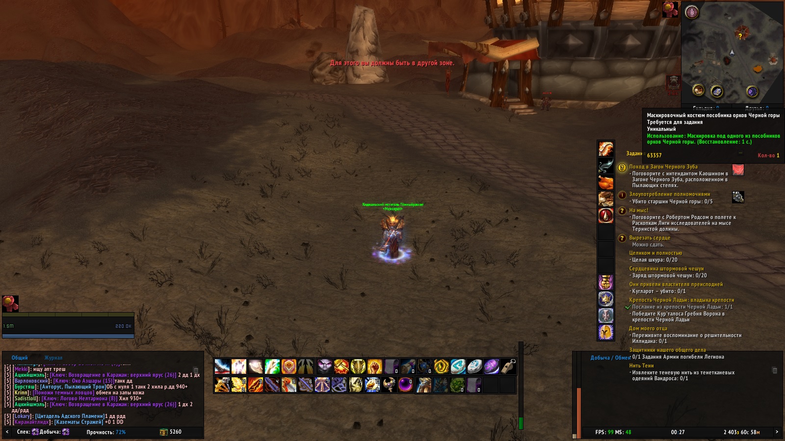 | Additional Information | Не получается одеть "Маскировочный костюм пособника орков Черной Горы" , пишет "Для этого вы должны находится в другой зоне". По видео ютуб, можно увидеть, что он надевается, а на сервере нет. Из за чего, нельзя сделать достижение "Задания в пылающих степях". Скриншоты и видео ниже. https://www.youtube.com/watch?v=dHZvbeM8uSs | ||||