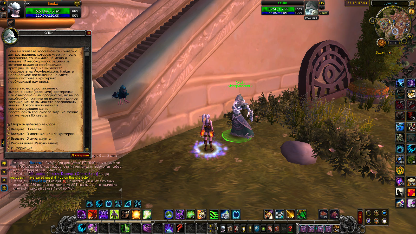 | Description | Здравствуйте. Legion x100 прошел своим друидом 3 цепочки на арт Сова Ферал Хил но на Медведя а именно на арт начального квеста нет в оплоте. https://www.wowhead.com/ru/quest=41468/хозяйка-когтей. Персонаж Jleuka . Кеш удалял через ЛК исправлял через дебагера в даларане тоже исправлял ничего не помогает. |