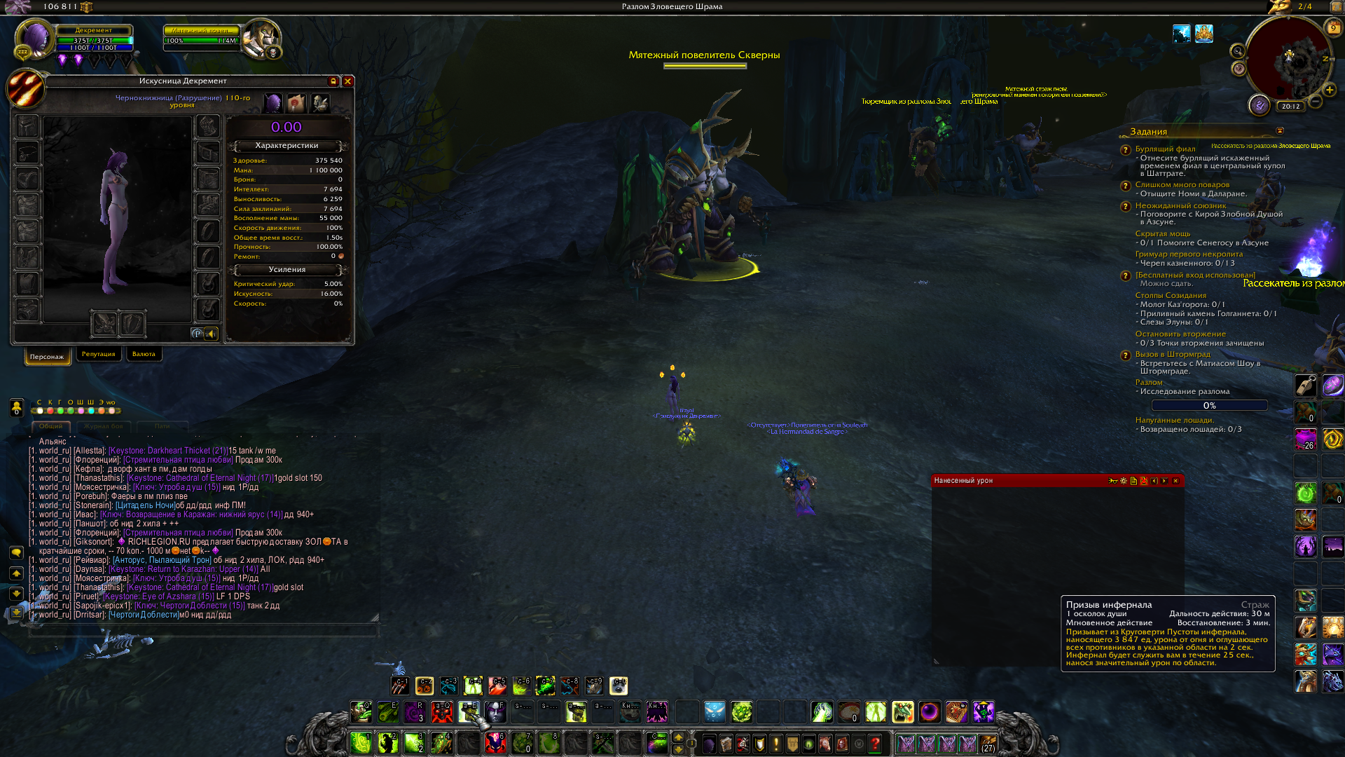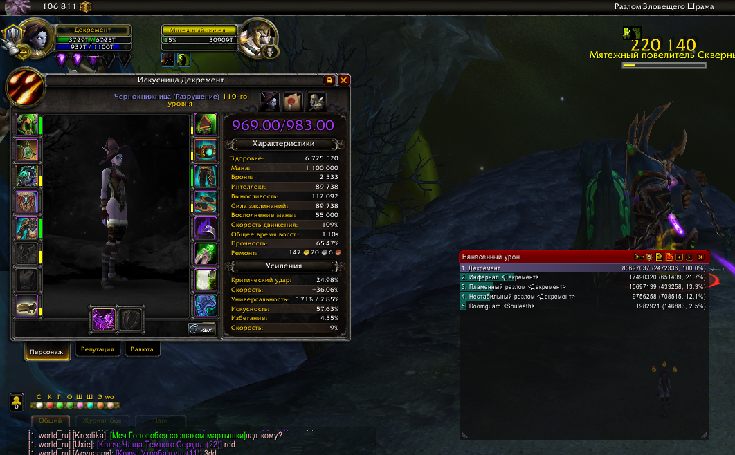по поводу первого комента вашего,я играю на легион x5 по поводу 2-го это урон оверол за фул инст 1.4% (мейн абилка варлока) которая юзается раз в 3 минуты и с фул инферналами 10 минут! и 3-е куда выше одеваться?у меня илвл уже 913 фул гир кованный титанами! |