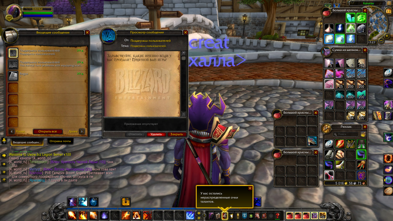 | Steps To Reproduce | Передавал вещи, с основного персонажа Bagsa, на твинка icecreat, в одном письме были как наследуемые предметы, так и предметы которые привязаны к учетной записи, пример (Незапятнанное оплечье). Таких вещей было 4 из них 1 вещь осталась, 3 пропали. Первые пару часов приходило пустое письмо от близард, но вещей в нем не было. Как вернуть вещи и что это вообще было??? | ||||