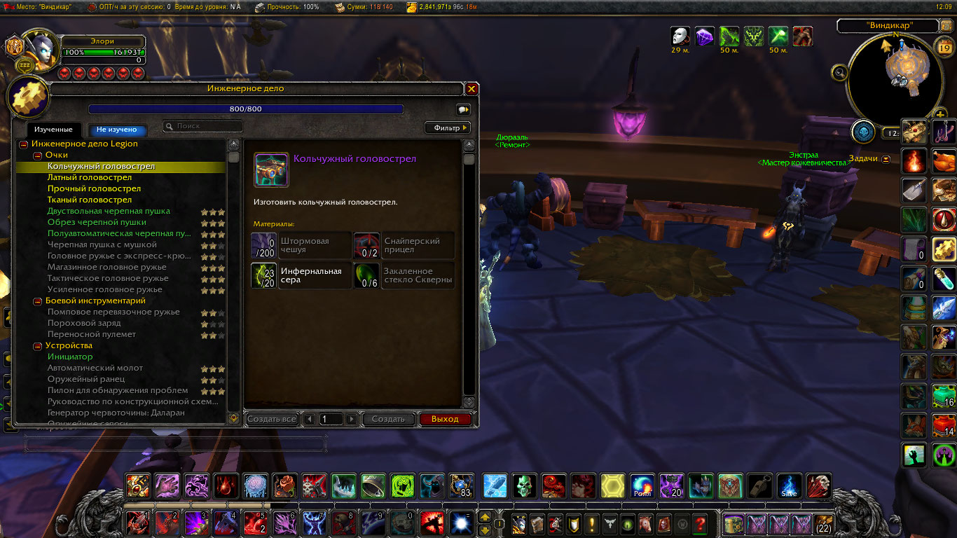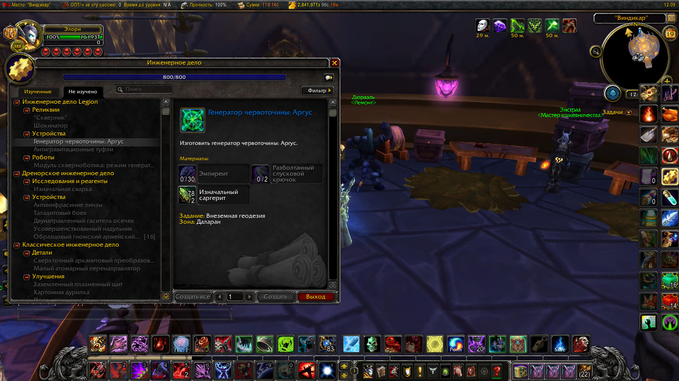 Цепочка на Аргус выполнена полностью, даже финальные квесты. Так же инженерное дело прокачено на фул, не хватает лишь нескольких рецептов из Легиона |